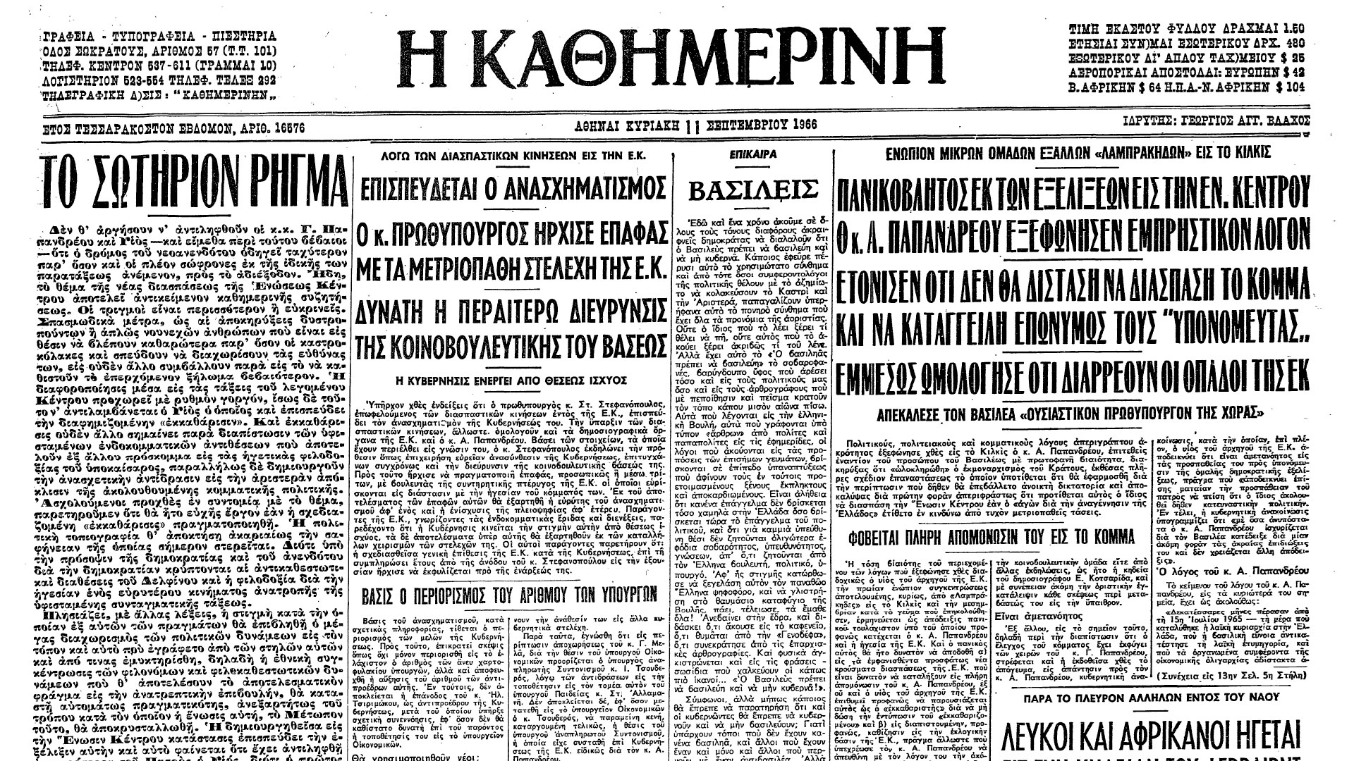 Τη δική της εκδοχή στις πολιτικές εξελίξεις στην Ελλάδα, ιδιαίτερα στον χώρο του Κέντρου, έδωσε η «Καθημερινή» στο κύριο άρθρο της, επίσης στο φύλλο της 11ης Σεπτεμβρίου. «Δεν θ’ αργήσουν ν’ αντιληφθούν οι κ.κ. Γ. Παπανδρέου και Υιός –και είμεθα τούτου βέβαιοι– ότι ο δρόμος του νεοανενδότου οδηγεί ταχύτερον παρ’ όσον και οι πλέον σώφρονες εκ της ιδικής των παρατάξεως ανέμενον, προς το αδιέξοδον. Ήδη, το θέμα της νέας διασπάσεως της Ενώσεως Κέντρου αποτελεί αντικείμενον καθημερινής συζητήσεως. Οι τριγμοί είναι περισσότερον ή ευκρινείς. Σπασμωδικά μέτρα, ως αι αποκηρύξεις δυστροπούντων ή απλώς νουνεχών ανθρώπων που είναι εις θέσιν να βλέπουν καθαρώτερα παρ’ όσον οι καστροφύλακες και σπεύδουν να διαχωρίσουν τας ευθύνας των, εις ουδέν άλλο συμβάλλουν παρά εις το να καθιστούν το επερχόμενον ξήλωμα βεβαιότερον.