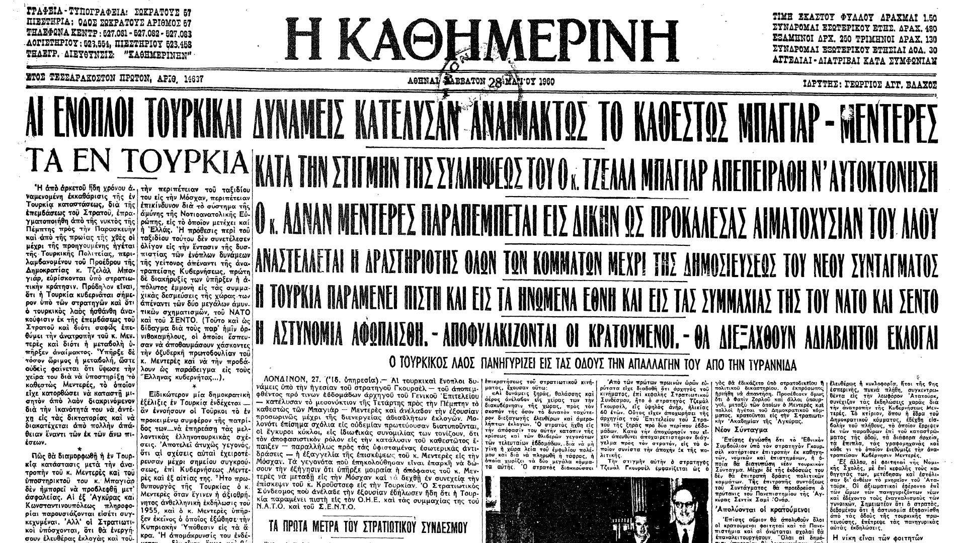 «Αι τουρκικαί ένοπλοι δυνάμεις υπό την ηγεσίαν του στρατηγού Γκουρσέλ –του αποπεμφθέντος προ τινών εβδομάδων αρχηγού του Γενικού Επιτελείου– κατέλυσαν το μεσονύκτιον της Τετάρτης προς την Πέμπτην το καθεστώς των Μπαγιάρ-Μεντερές και ανέλαβον την εξουσίαν προσωρινώς μέχρι της διενεργείας αδιαβλήτων εκλογών», έγραψε στο πρωτοσέλιδό της η «Καθημερινή» την επομένη του πραξικοπήματος. Η διανδρία Μπεντερές-Μπαγιάρ μαζί με τους συνεργάτες της παραπέμφθηκαν σε δίκη. Κύρια κατηγορία ήταν η παραβίαση του Συντάγματος, το οποίο βέβαια παραβίασαν και οι στρατιωτικοί πραγματοποιώντας το πραξικόπημα, ενώ άλλες κατηγορίες αφορούσαν τη διαφθορά και την οργάνωση του ανθελληνικού πογκρόμ τον Σεπτέμβριο του 1955.