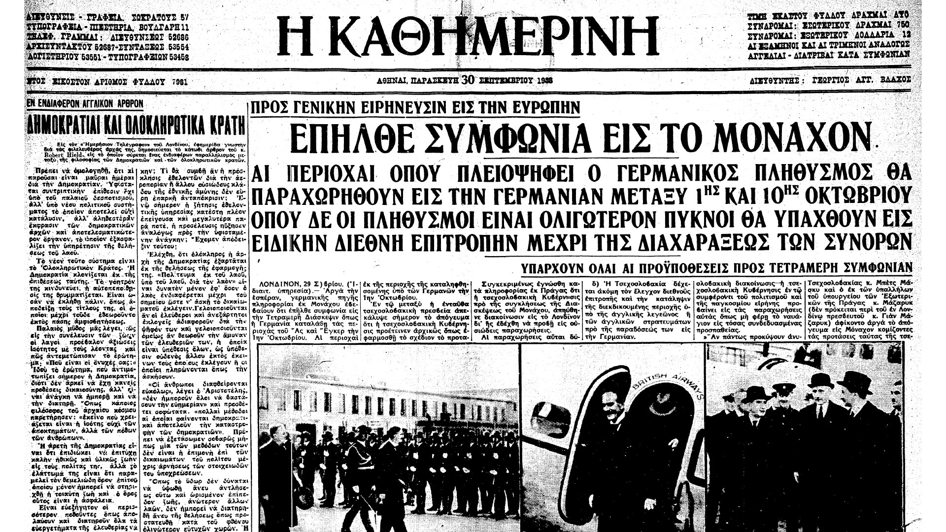 Η Τσεχοσλοβακία ενημερώθηκε από τη Μεγάλη Βρετανία και τη Γαλλία ότι μπορούσε είτε να αντισταθεί στη Γερμανία μόνη της είτε να υποταχθεί στις προβλεπόμενες προσαρτήσεις, με αποτέλεσμα να αποδεχθεί τη συμφωνία της Διάσκεψης. Διαβάζουμε στην «Καθημερινή» το κείμενο της διακοίνωσης της τσεχοσλοβαβικής πλευράς, το οποίο μεταξύ άλλων αναφέρει ότι «η τσεχοσλοβακική Κυβέρνησις εν τω συμφερόντι του πολιτισμού και της παγκοσμίου ειρήνης προβαίνει εις τας παραχωρήσεις αυτάς όπως μη φέρει το ναυάγιον εις τόσας συνδεδυασμένας προσπαθείας. Αν πάντως προκύψουν ανυπέρβλητοι δυσχέρειαι, η τσεχοσλοβακική Κυβέρνησις προτείνει όπως η όλη διένεξις αποτελέση το αντικείμενον διεθνούς διασκέψεως και υποβληθή εις την διαιτησίαν του Προέδρου Ρούζβελτ. Η τσεχοσλοβαβική Κυβέρνησις δηλοί ότι απεκδέχεται εκ των προτέρων τοιαύτην ετυμηγορίαν».