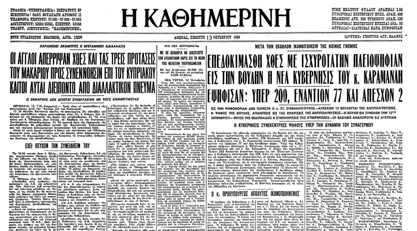 «Δι’ αποφασιστικής πρωτοβουλίας του, εκδηλωθείσης την εσπέραν χθες, ο Βασιλεύς έδωσε λύσιν εις την δημιουργηθείσαν μετά τον θάνατο του Στρατάρχου Παπάγου, χαώδη πολιτικήν κατάστασιν. Καλέσας ο Άναξ την 8.30΄ μ.μ. χθες τον κ. Κων. Καραμανλήν, έδωσεν εις αυτόν την εντολή του σχηματισμού της νέας Κυβερνήσεως. Η βασιλική εντολή συνοδεύεται και από ανοικτήν εξουσιοδότησιν διαλύσεως της Βουλής εις περίπτωσιν κατά την οποίαν αύτη δεν ήθελε παράσχει ψήφον εμπιστοσύνης εις την νέαν Κυβέρνησιν, η οποία θα ορκισθή σήμερον», έγραψε η «Καθημερινή» στο πρωτοσέλιδο της 6ης Οκτωβρίου 1955 σχολιάζοντας την εντολή σχηματισμού κυβέρνηση, την οποία έλαβε ο Μακεδόνας πολιτικός στις 5 Οκτωβρίου.