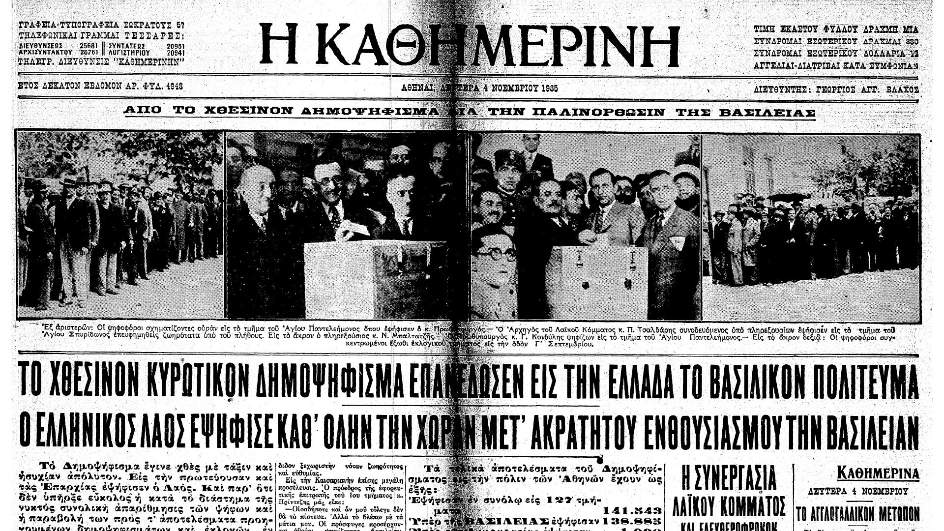 Χαρακτηριστικό τού όλου κλίματος είναι το πρωτοσέλιδο της «Καθημερινής» στις 4 Νοεμβρίου, σύμφωνα με το οποίο «το χθεσινόν κυρωτικόν δημοψήφισμα επανέδωσεν εις την Ελλάδα το Βασιλικόν Πολίτευμα. Ο Ελληνικός λαός εψήφισε καθ’ όλη την χώραν μετ’ ακρατήτου ενθουσιασμού». Διαβάζουμε πιο κάτω στο ίδιο άρθρο ότι «δύο πράγματα εχαρακτήρισαν το χθεσινόν επικυρωτικόν της αποφάσεως της Εθνοσυνελεύσεως δημοψήφισμα: η μεγάλη συρροή του λαούς εις τας κάλπας και η παραδειγματική τάξις, η οποία επεκράτησεν εις όλα τα τμήματα από της αρχής μέχρι του τέλους της ψηφοφορίας. […] Οι περισσότεροι εψήφιζαν φανερά. Ελάχιστοι επήγαιναν εις το ιδιαίτερον χώρισμα διά να θέσουν μυστικώς το ψηφοδέλτιον που αντιπροσώπευε τα φρονήματά των εις τον εσφραγισμένον φάκελλον. Ελάχιστοι εδέχοντο να πάρουν το κόκκινο ψηφοδέλτιον της αβασιλεύτου. Οι περισσότεροι έπερναν το γαλανό της βασιλευομένης, το έριχναν μέσα εις τον φάκελλον και επερίμεναν σιωπηλοί μέχρις ότου γραφή το όνομά των εις τον τηρούμενον κατάλογον και τους δοθή η άδεια να ρίψουν τον φάκελλον εις την ψηφοδόχον».