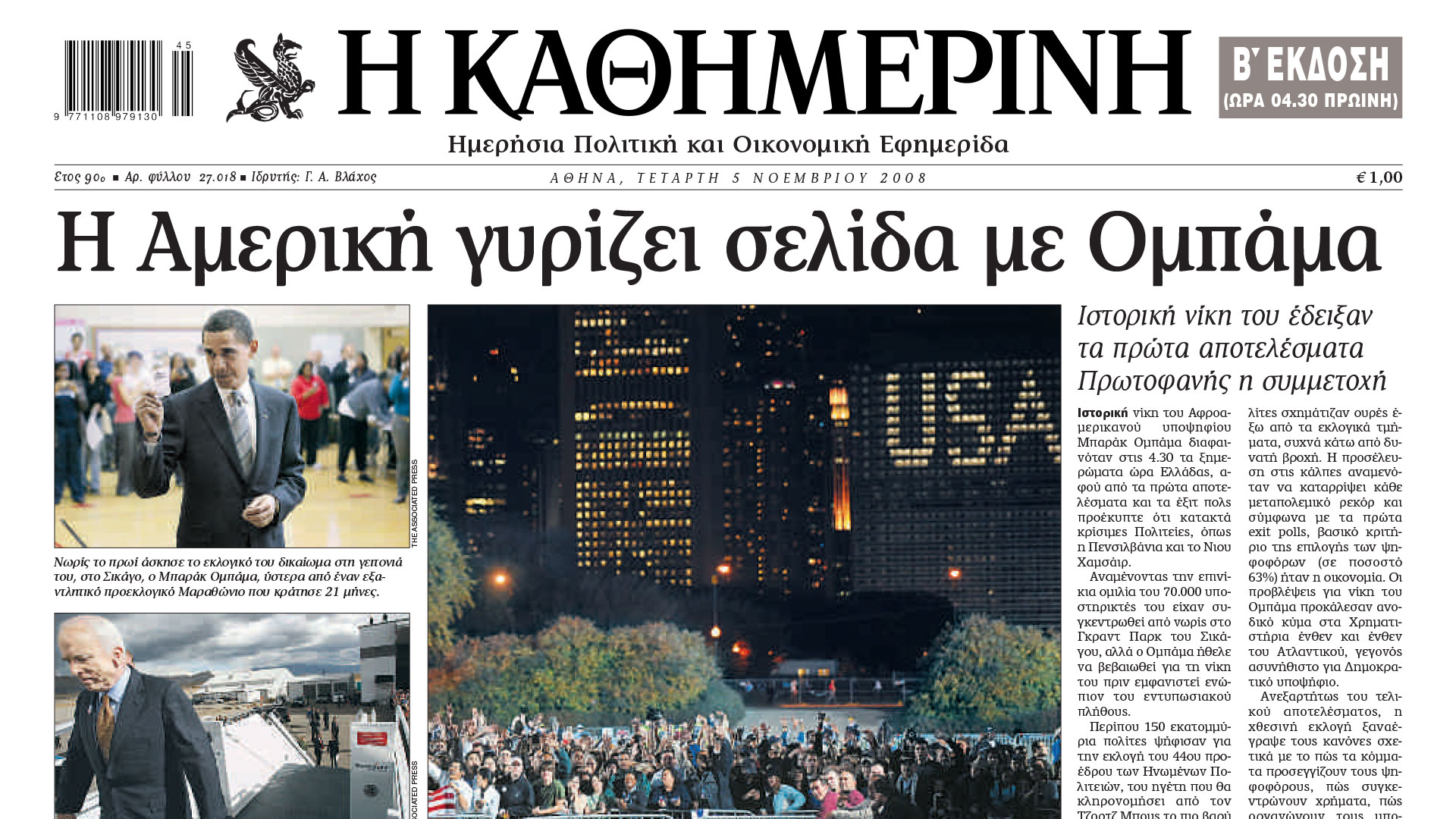 Χαρακτηριστικό είναι το σχετικό άρθρο στο πρωτοσέλιδο της «Καθημερινής» της 5ης Νοεμβρίου 2008. «Ύστερα από μια ιστορική αναμέτρηση, η Αμερική δείχνει να γυρίζει σελίδα», αναφέρεται στην αρχή, ενώ στη συνέχεια διαβάζουμε ότι «περίπου 150 εκατομμύρια πολίτες ψήφισαν για την εκλογή του 44ου προέδρου των Ηνωμένων Πολιτειών, του ηγέτη που θα κληρονομήσει από τον Τζορτζ Μπους το πιο βαρύ φορτίο εσωτερικών και διεθνών προκλήσεων από την εποχή του Φραγκλίνου Ρούσβελτ. Από τα χαράματα, εκατοντάδες πολίτες σχημάτιζαν ουρές έξω από τα εκλογικά τμήματα, συχνά κάτω από δυνατή βροχή. Η προσέλευση στις κάλπες αναμενόταν να καταρρίψει κάθε μεταπολεμικό ρεκόρ και σύμφωνα με τα πρώτα exit polls, βασικό κριτήριο της επιλογής των ψηφοφόρων (σε ποσοστό 63%) ήταν η οικονομία».