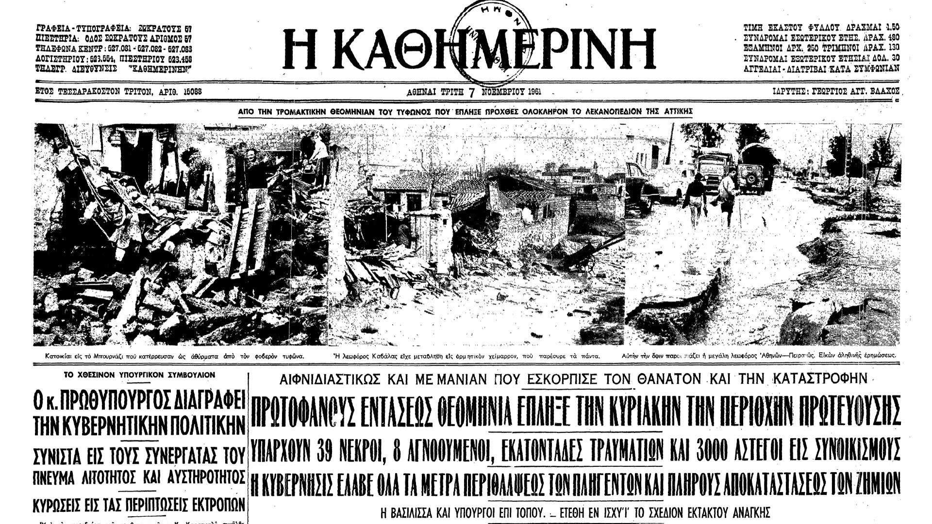 «Ένας σπανιωτάτης εντάσεως και διαρκείας τυφών, με επίκεντρον τον Σαρωνικόν, έπληξεν από των πρώτων πρωινών ωρών της Κυριακής την περιοχήν της πρωτευούσης. Οι κάτοικοι των Αθηνών, του Πειραιώς και των περιχώρων, έζησαν μίαν εφιαλτικήν νύκτα, κατά την οποίαν εμαίνοντο, κυριολεκτικώς, όλα τα στοιχεία της φύσεως. Το στερέωμα κατηυγάζετο από τας αλλεπαλλήλους αστραπάς και τους κεραυνούς, ενώ ταυτοχρόνως, πρωτοφανούς μεγέθους χάλαζα και καταπληκτική συνεχής νεροποντή μετέβαλον τας λεωφόρους εις ποταμούς και τας οδούς εις ορμητικά ρεύματα, προ της μανίας των οποίων τίποτε δεν ήτο δυνατόν ν’ αντισταθή», έγραψε στο πρωτοσέλιδό της η «Καθημερινή».