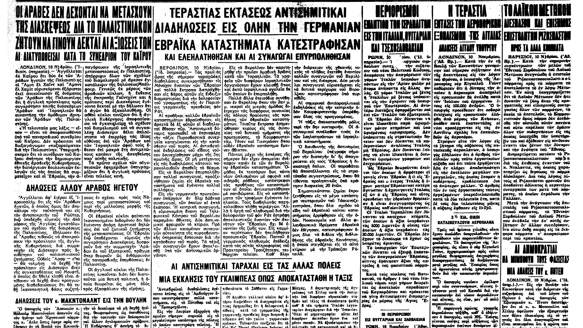 Χαρακτηριστικό είναι το σχετικό άρθρο της «Καθημερινής», στις 11 Νοεμβρίου: «Τας πρωΐας ώρας της σήμεροον, ταραχώδεις διαδηλώσεις συνεκροτήθησαν εις Μόναχον εναντίον των Εβραίων και πολλά έκτροπα διεπράχθησαν εις βάρος αυτών εις ένδειξιν διαμαρτυρίας διά την δολοφονίαν του γραμματέως τής εν Παρισίοις γερμανικής πρεσβείας φον Ρατ».