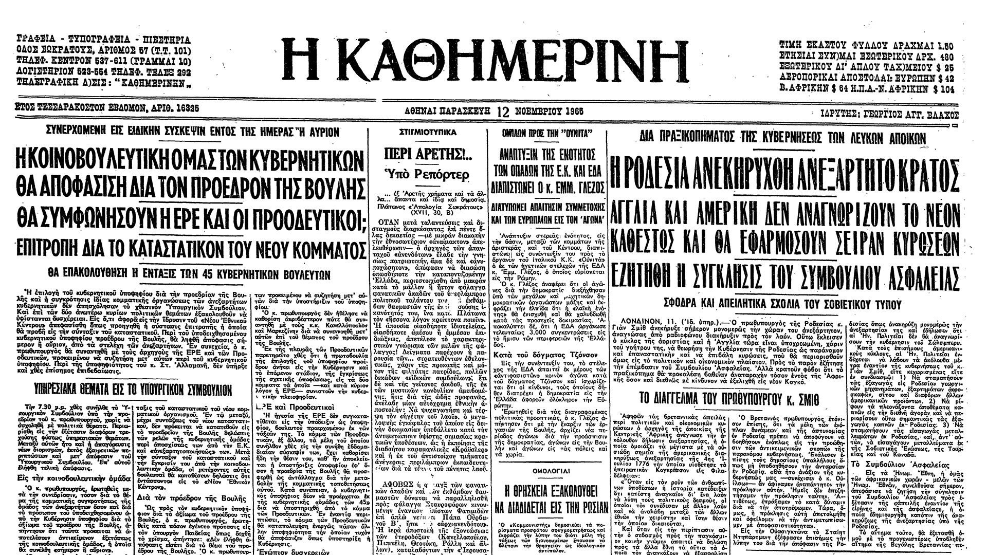 Όπως ήταν φυσικό, τόσο η Μεγάλη Βρετανία όσο και η Κοινοπολιτεία θεώρησαν παράνομη τη μονομερή αυτή διακήρυξη. Δεν ήταν όμως μόνο αυτές. Διαβάζουμε ότι «Αγγλία και Αμερική δεν αναγνωρίζουν το νέον καθεστώς και θα εφαρμόσουν σειράν κυρώσεων», ενώ παράλληλα «εζητήθη η σύγκλησις του Συμβουλίου Ασφαλείας» από την ομάδα των αφρικανικών χωρών-μελών του ΟΗΕ «προς εξέτασιν της “απειλής εναντίον της ειρήνης και της ασφαλείας”, η οποία εδημιουργήθη κατόπιν της ανακηρύξεως της ανεξαρτησίας υπό της Ροδεσίας». Υπήρχαν φόβοι υπήρχαν μήπως προκαλούσε «βαθείαν αναταραχήν τόσον εντός της Αφρικής όσον και διεθνώς με κίνδυνον να εξελιχθή εις νέον Κογκό». Τα Ηνωμένα Έθνη, εν τέλει θα επέβαλλαν, για πρώτη φορά στην ιστορία τους, οικονομικές κυρώσεις.
