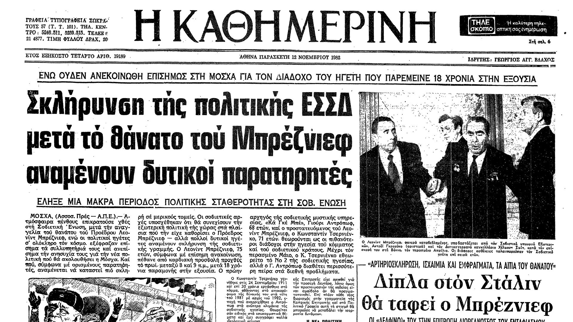 Ο Σοβιετικός ηγέτης Λεονίντ Μπρέζνιεφ έφυγε από τη ζωή στις 10 Νοεμβρίου 1982. «Ατμόσφαιρα πένθους επικρατούσε χθες στη Σοβιετική Ένωση, μετά την αναγγελία του θανάτου του Προέδρου Λεονίντ Μπρέζνιεφ, ενώ οι πολιτικοί ηγέτες σ’ ολόκληρο τον κόσμο εξέφρασαν επίσημα τα συλλυπητήριά τους και ανεπίσημα την ανησυχία τους για την νέα πολιτική που θα ακολουθήσει η Μόσχα. Και που, σύμφωνα με ορισμένους παρατηρητές, αναμένεται να καταστεί πιο σκληρή σε μερικούς τομείς. Οι σοβιετικές αρχές υποσχέθηκαν ότι θα συνεχίσουν την εξωτερική πολιτική της χώρας στα πλαίσια που την είχε καθορίσει ο Πρόεδρος Μπρέζνιεφ – αλλά πολλοί δυτικοί ηγέτες αναμένουν σκλήρυνση της σοβιετικής γραμμής. Ο Λεονίντ Μπρέζνιεφ, 75 ετών, σύμφωνα με επίσημη ανακοίνωση, πέθανε από καρδιακή προσβολή προχθές το πρωί μεταξύ 8 και 9 π.μ., μετά από 18 χρόνια παραμονής στην εξουσία», έγραψε σχετικά η «Καθημερινή» στο πρωτοσέλιδό της στις 12 Νοεμβρίου.