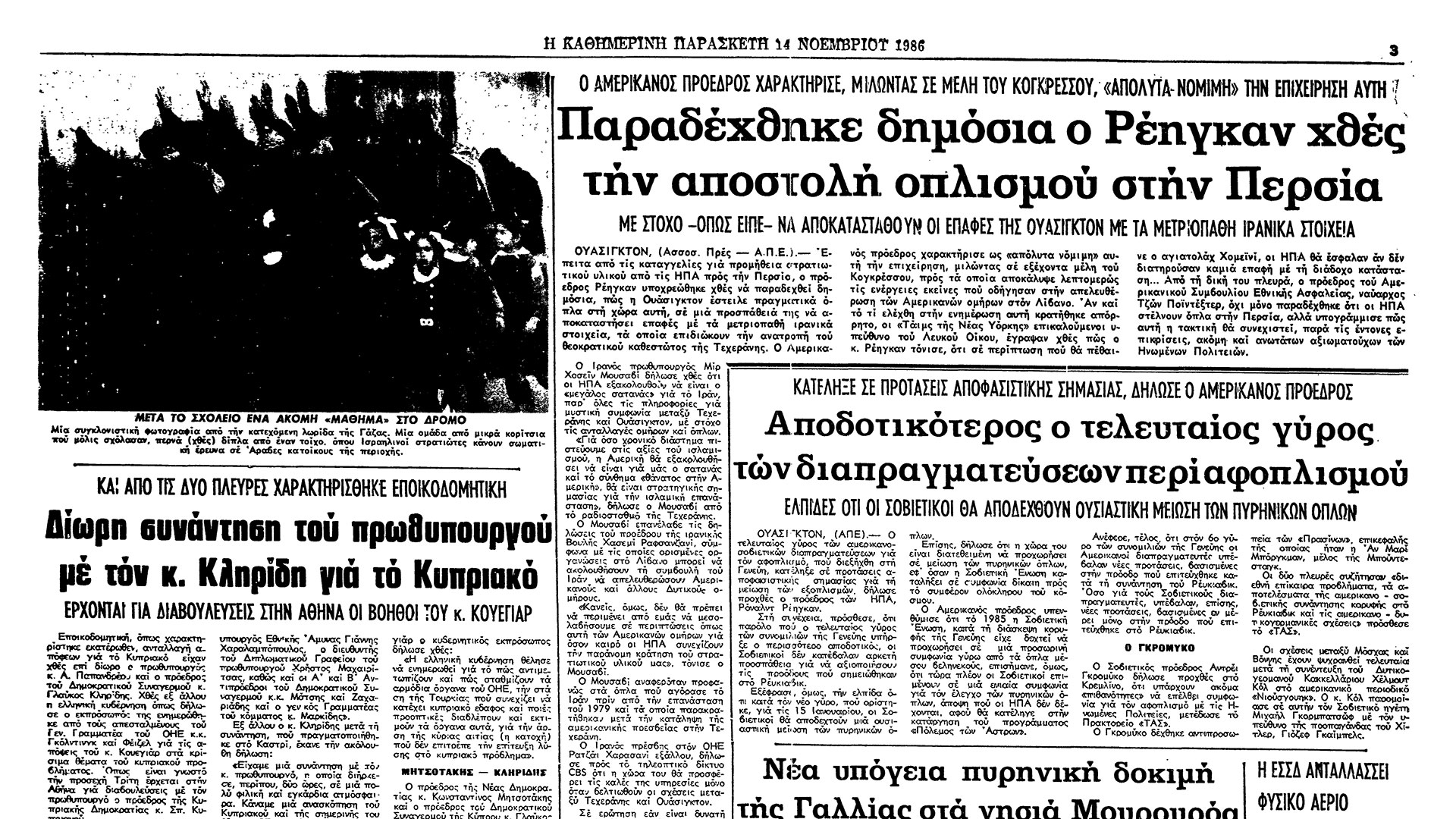 «Αν και το τι ελέχθη στην ενημέρωση αυτή κρατήθηκε απόρρητο», έγραφε την επομένη η «Καθημερινή», «οι “Τάιμς της Νέας Υόρκης” επικαλούμενοι υπεύθυνο του Λευκού οίκου, έγραψαν χθες πως ο κ. Ρέηγκαν τόνισε, ότι σε περίπτωση που θα πέθαινε ο αγιατολάχ Χομεϊνί, οι ΗΠΑ θα έσφαλαν αν δεν διατηρούσαν καμιά επαφή με τη διάδοχο κατάσταση… Από τη δική του πλευρά, ο πρόεδρος του Αμερικανικού Συμβουλίου Εθνικής Ασφαλείας, ναύαρχος Τζων Ποϊντέξτερ, όχι μόνο παραδέχθηκε ότι οι ΗΠΑ στέλνουν όπλα στην Περσία, αλλά υπογράμμισε πως αυτή η τακτική θα συνεχιστεί, παρά τις έντονες επικρίσεις, ακόμη και ανωτάτων αξιωματούχων των Ηνωμένων Πολιτειών». (Πράγματι, αντίθετοι με το εγχείρημα αυτό ήταν οι υπουργοί Εξωτερικών και Άμυνας, Τζορτζ Σουλτς και Κάσπαρ Γουάινμπεργκερ).