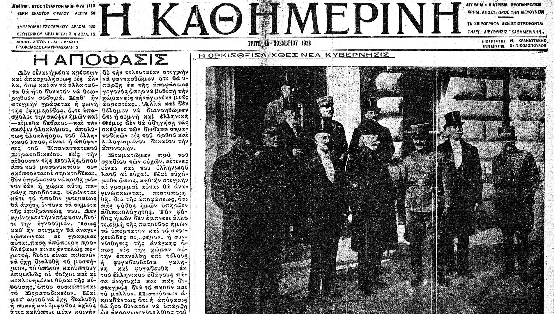 »Εν ονόματι του Βασιλέως των Ελλήνων Γεωργίου Β΄. Το Έκτακτον Επαναστατικόν Στρατοδικείον σκεφθέν κατά Νόμον. […] Κηρύσσει παμψηφεί τους κατηγορουμένους 1) Δημήτριον Γούναρην, 2) Νικόλ Στράτον, 3) Πέτρον Πρωτοπαπαδάκην, 4) Νικόλαον Θεοτόκην, 5) Γεώργιον Χατζανέστην, 6) Ξενοφώντα Στρατηγόν, 7) Μιχαήλ Γούδαν και 8) Γεώργιον Μπαλτατζήν. […]