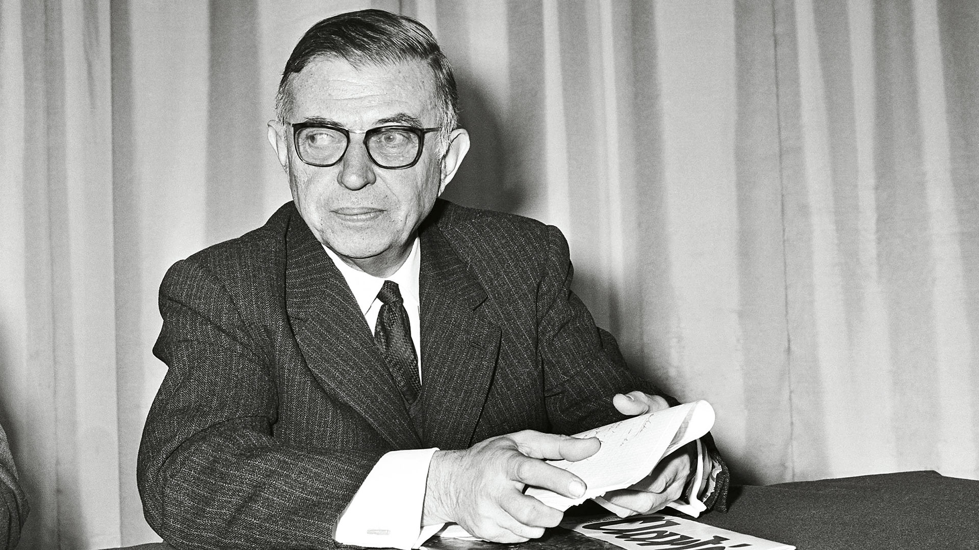 Η προσωπικότης η οποία κρύπτεται οπίσω από το γενικόν τούτο ενδιαφέρον διά τον υπαρξισμόν είναι ένας κοντός, άσχημος, 40 ετών άνθρωπος, ονόματι Ζαν-Πωλ Σαρτρ. Φιλόσοφος, μυθιστοριογράφος, συγγραφεύς θεατρικών έργων και δοκιμίων, ο Σαρτρ ήτο επί 13 έτη αφανής καθηγητής της Φιλοσοφίας. Υπηρέτησεν εις τον γαλλικόν στρατόν, συνελήφθη αιχμάλωτος το 1940 και παρέμεινεν επί εννέα μήνας εις ένα γερμανικόν στρατόπεδον αιχμαλώτων. Όταν απελύθη, εκινδύνευε να οδηγηθή εις στρατόπεδον συγκεντρώσεως και προ του εκτελεστικού αποσπάσματος, λόγω της ενεργού αναμίξεώς του εις το υπό κομμουνιστικήν επιρροήν Γαλλικόν Μέτωπον Αντιστάσεως.