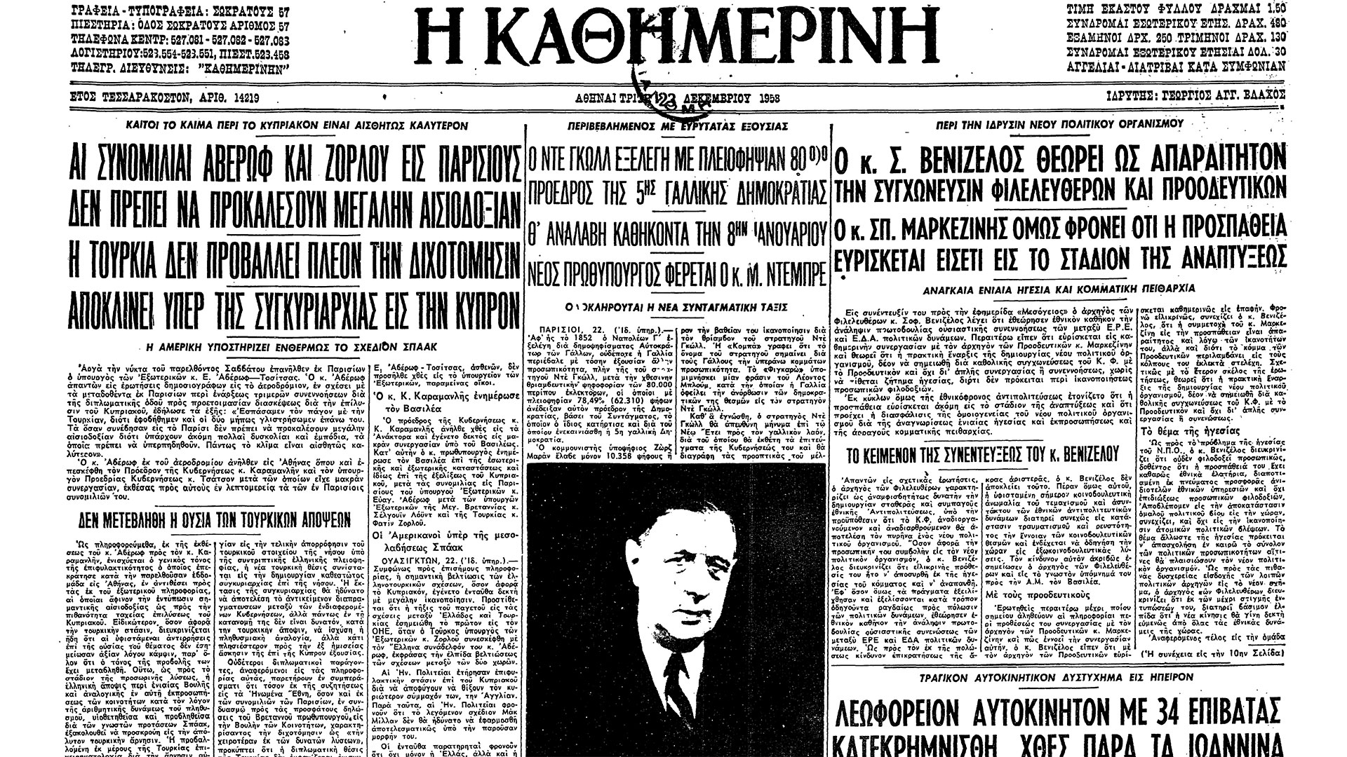 Ο Σαρλ Ντε Γκωλ εξελέγη πρώτος πρόεδρος της Πέμπτης Γαλλικής Δημοκρατίας στις εκλογές της 21ης Δεκεμβρίου 1958. «Αφ’ ής το 1852 ο Ναπολέων Γ΄ εξελέγη διά δημοψηφίσματος Αυτοκράτωρ των Γάλλων, ουδέποτε η Γαλλία περιέβαλε με τόσην εξουσίαν άλλην προσωπικότητα, πλην της του στρατηγού Ντε Γκωλλ, μετά την χθεσινήν θριαμβευτικήν ψηφοφορίαν των 80.000 περίπου εκλεκτόρων, οι οποίοι με πλειοψηφίαν 78,49% (62.310) ψήφων ανέδειξαν αυτόν πρόεδρον της Δημοκρατίας, βάσει του Συντάγματος, το οποίον ο ίδιος κατήρτισε και διά του οποίου ενεκαινιάσθη η 5η γαλλική Δημοκρατία», έγραψε η «Καθημερινή» στο πρωτοσέλιδό της στις 23 Δεκεμβρίου 1958.