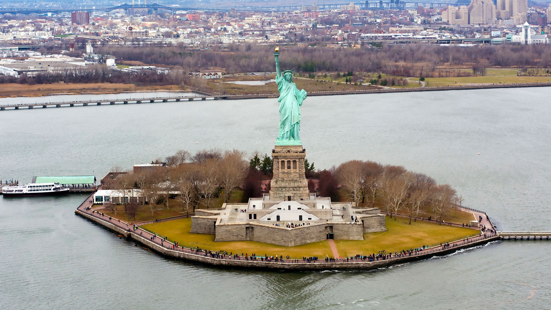 Νωρίς το πρωί της 17ης Ιουνίου 1885, εν μέσω πυκνής ομίχλης, κατέφθανε στο λιμάνι της Νέας Υόρκης το γαλλικό πολεμικό πλοίο “Isère”. «Το αμπάρι του σκάφους ήταν ένα περίεργο θέαμα. Τεράστια κιβώτια, το καθένα από τα οποία περιείχε πολλούς τόνους μετάλλου, ήταν στοιβαγμένα τόσο τακτοποιημένα και με τόση οικονομία χώρου όσο και τα τούβλα σε ένα πλοίο του ποταμού Χάντσον. Το διάδημα βρισκόταν σε ένα τοξωτό πλαίσιο αρκετά μεγάλο για να περάσει από κάτω ένα άλογο με άμαξα. Άλλα κομμάτια, τα οποία δύσκολα μπορούσε να αναγνωρίσει κανείς από τον προσεκτικό τρόπο με τον οποίο ήταν συσκευασμένα, ήταν στριμωγμένα κάτω από αυτό, μέχρι που φαινόταν ότι οι σιδερένιες πλευρές του σκάφους θα διογκώνονταν κάτω από το τεράστιο βάρος. Τα μάτια και η μύτη γέμιζαν ένα κιβώτιο, το μέτωπο ένα άλλο, ένα αυτί και μέρος της κόμης ένα άλλο, μέχρι που κάθε μέτρο χώρου φαινόταν να αξιοποιείται. Μια “μπούκλα” από λαμαρίνα έμοιαζε αρκετά μεγάλη για το φουγάρο μιας μικρής ατμοκίνητης λέμβου. Ένας ναυτικός είπε ότι είχε μήκος 8 πόδια», έγραφε ο δημοσιογράφος των New York Times.