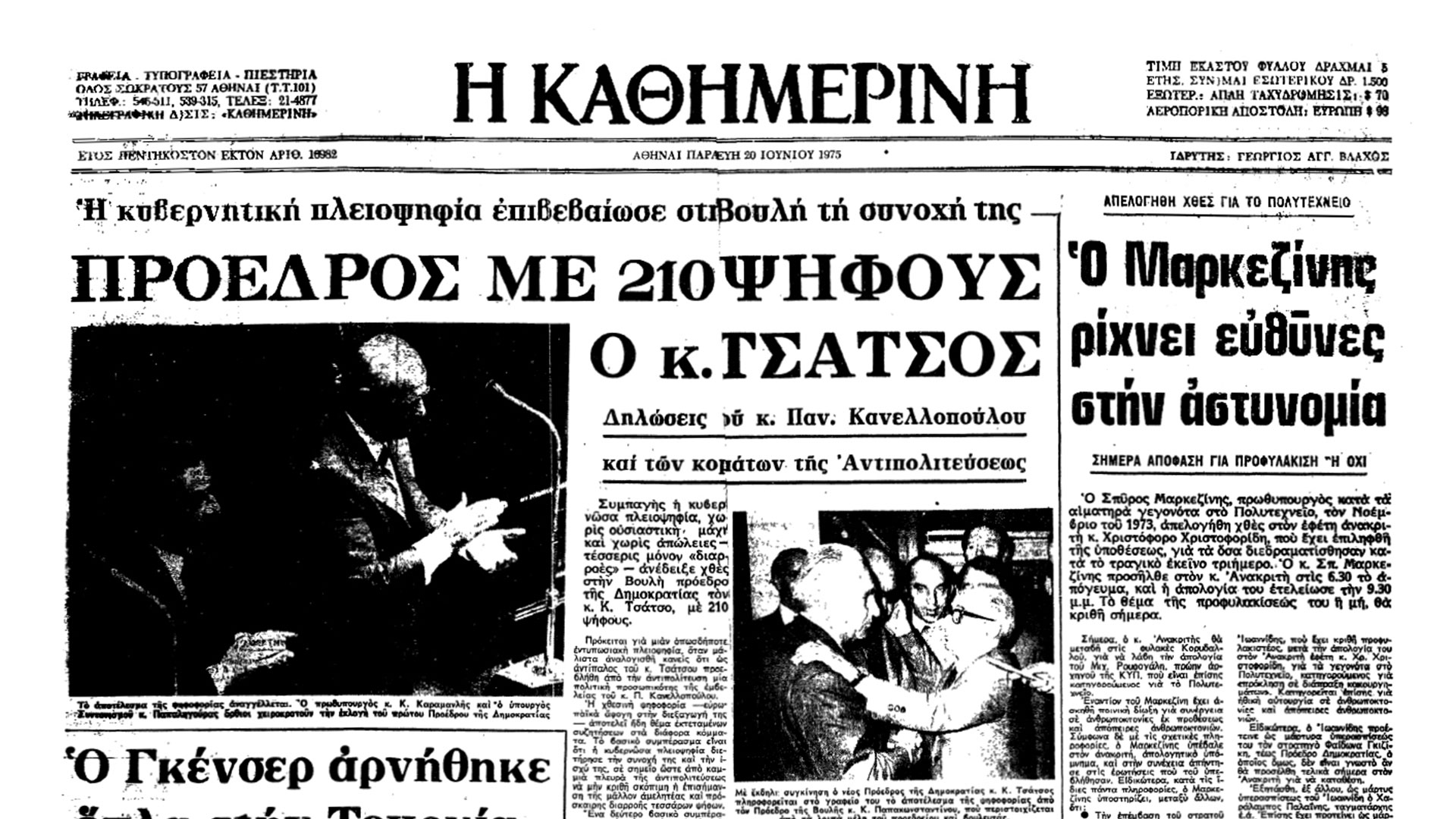 Η ψηφοφορία για την εκλογή του πρώτου Προέδρου της Δημοκρατίας υπό το νέο Σύνταγμα πραγματοποιήθηκε στις 19 Ιουνίου 1975. Πλειοψήφησε η υποψηφιότητα του Κωνσταντίνου Τσάτσου, ο οποίος υποστηρίχτηκε από τη ΝΔ, συγκεντρώνοντας 210 ψήφους. Ανθυποψήφιος του Τσάτσου για το ύπατο πολιτειακό αξίωμα της χώρας ήταν ο Παναγιώτης Κανελλόπουλος. Η Ελλάδα εισήλθε και επισήμως στη δημοκρατική ομαλότητα το καλοκαίρι του 1975.