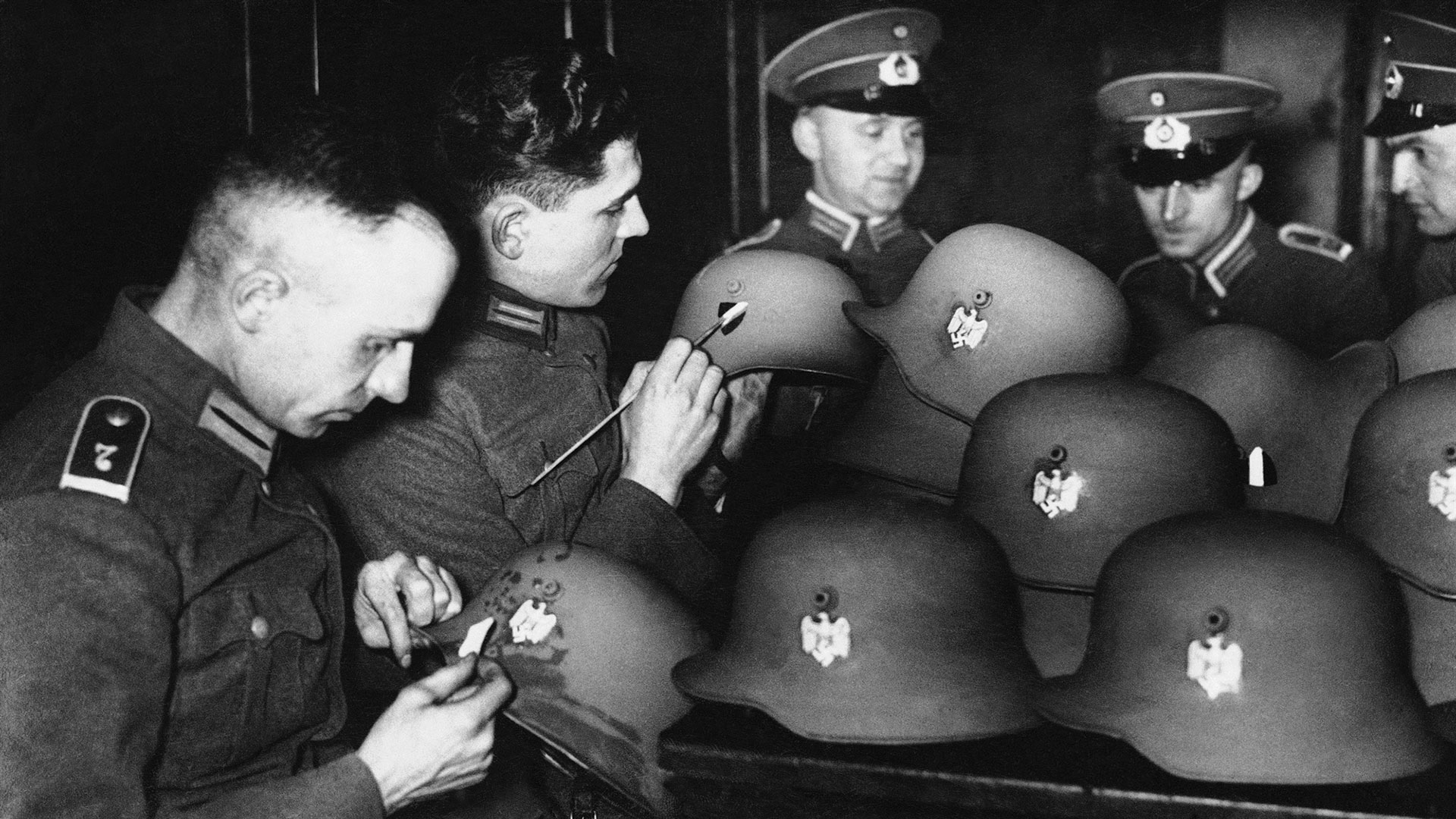 ΘΡΙΑΜΒΟΣ: O Χίτλερ διήλθε την κρισιμωτέραν εβδομάδα αφ’ ης ανέλαβε την εξουσίαν αλλά κατήγαγεν αληθή θρίαμβον εξουδετερώσας ταυτοχρόνως τόσον την αντίδρασιν των φον Πάπεν και Γκαίμπελς όσον και του αρχηγού των χαλυβδοκράνων Σέλτε. Οι αξιωματικοί της Ράιχσβερ εδήλωσαν ότι δεν ευνοούν οιανδήποτε πολιτικήν μεταβολήν και ότι θα ανήκουν μόνον εις τας διαταγάς των Χίντεμπουργκ και Χίτλερ. [Φωτογραφία, οι πρώτες σβάστικες προστίθενται στα κράνη των Χαλυβδόκρανων]