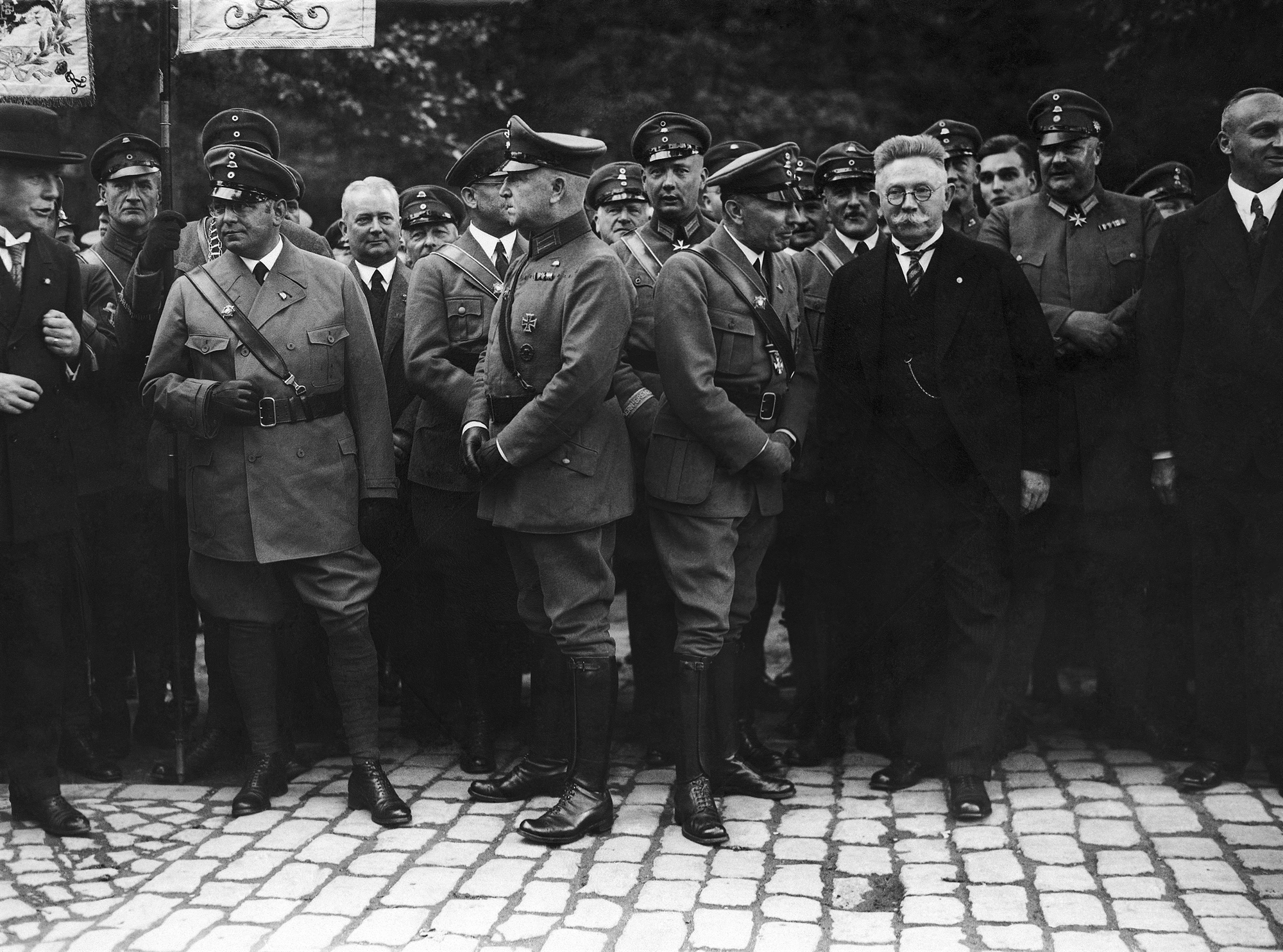 ΠΡΟΣΕΓΓΙΣΗ: Η τελευταίως αναφυείσα διένεξις μεταξύ των τμημάτων εφόδου και των χαλυβδοκράνων διεκανονίσθη οριστικώς κατόπιν φιλικής συσκέψεως μεταξύ του νέου επιτελάρχου των φαιοχιτώνων Λούντε και του αρχηγού των χαλυβδοκράνων, υπουργού Εργασίας Σέλντε (φωτ.: δεύτερος από αριστερά, σε συνάντηση χαλυβδοκράνων). Ο Σέλντε ομιλών εις το συνέδριον των χαλυβδοκράνων εδήλωσεν ότι επήλθε πλήρης προσέγγισις μεταξύ των δύο οργανώσεων. Η συμφωνία –είπεν– ήτο τοσούτω μάλλον εύκολος καθόσον αι δύο οργανώσεις αποτελούν ενιαίον εθνικοσοσιαλιστικόν μέτωπον, οι δε χαλυβδόκρανοι αποτελούν την εφεδρείαν των τμημάτων εφόδου. Το συνέδριον έληξε με ομόθυμον δήλωσιν περί απεριορίστου πίστεως προς τον Αδόλφον Χίτλερ.