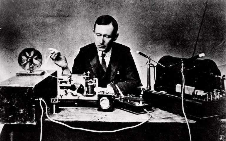 Το 1894, ο Μαρκόνι άρχισε να πειραματίζεται στο κτήμα του πατέρα του κοντά στην Μπολόνια, χρησιμοποιώντας σχετικά πρωτόλειες συσκευές. Μετά τα αρχικά του πειράματα, τα οποία αφορούσαν μετάδοση σημάτων σε μικρή απόσταση, με συστηματικές δοκιμές και διορθώσεις αύξησε την απόσταση μετάδοσης χρησιμοποιώντας μια κατακόρυφη κεραία με μεταλλική πλάκα στην κορυφή ενός στύλου, που συνδεόταν με παρόμοια πλάκα στο έδαφος. Η εμβέλεια της μετάδοσης αυξήθηκε έτσι σε περίπου 2,4 χλμ. – αρκετά για να πειστεί για τις δυνατότητες του νέου αυτού συστήματος επικοινωνίας.