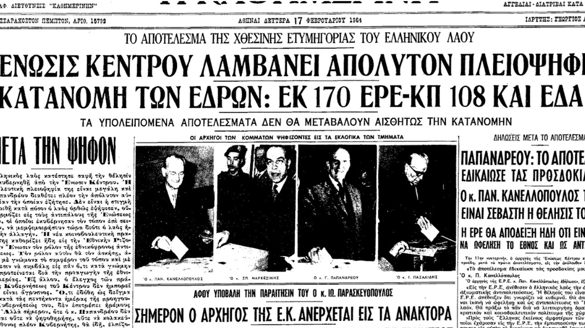 Στις εκλογές της 16ης Φεβρουαρίου 1964, η Ε.Κ. επιβεβαίωσε την κυριαρχία της στο πολιτικό σκηνικό, λαμβάνοντας το 52,7% των ψήφων και εκλέγοντας 171 βουλευτές. Αντιθέτως, η ΕΡΕ και το Κόμμα Προοδευτικών του Σπύρου Μαρκεζίνη, τα οποία εκπροσωπούσαν τον χώρο της Δεξιάς, συγκέντρωσαν από κοινού το 35,2% των ψήφων καταλαμβάνοντας στη νέα Βουλή 99 και 8 βουλευτικές έδρες αντίστοιχα. Η αύξηση των ποσοστών της Ε.Κ. έναντι της ΕΡΕ αποτελούσε τη μαζικότερη εκλογική μεταστροφή των μεταπολεμικών χρόνων που σημειώθηκε σε τόσο σύντομο χρονικό διάστημα.