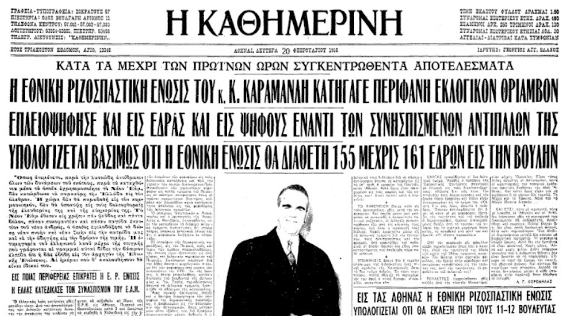 Στις εκλογές της 19ης Φεβρουαρίου 1956 η ΕΡΕ συγκέντρωσε το 47,38% των ψήφων, ενώ η Δ.Ε. το 48,15%. Παρά ταύτα, το κόμμα του Κωνσταντίνου Καραμανλή έλαβε άνετη κοινοβουλευτική πλειοψηφία καταλαμβάνοντας 165 έδρες στη νέα Βουλή, ενώ ο συνασπισμός με επικεφαλής τον Παπανδρέου μόλις 132, απόρροια του νέου εκλογικού συστήματος το οποίο εφαρμόστηκε σε αυτές τις εκλογές. Η επικράτηση της ΕΡΕ έδωσε στον Καραμανλή την απαραίτητη αυτοπεποίθηση για την εφαρμογή του πολιτικού του προγράμματος. Η νέα κυβέρνηση σχηματίστηκε στις 29 Φεβρουαρίου, περιλαμβάνοντας τόσο παλαιούς πολιτικούς της δεξιάς παράταξης όσο και πολλά νέα πρόσωπα.