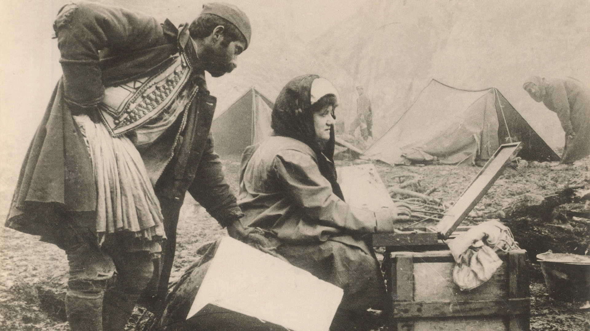 Στις 6 Ιανουαρίου 1913, εξασφαλίζει θέση στη βασιλική θαλαμηγό «Αμφιτρίτη» και αναχωρεί για το πολεμικό μέτωπο της Ηπείρου. Θα είναι παρούσα τη στιγμή που φτάνει στο εκεί στρατηγείο το τηλεγράφημα για τη νικηφόρα ναυμαχία της Λήμνου και στη θριαμβευτική επίσημη υποδοχή του Κωνσταντίνου στην Πρέβεζα. Κατόπιν φτάνει οδικώς στη Φιλιππιάδα, που αποτελεί κομβικό σημείο στο στρατιωτικό μέτωπο. Από εκεί θα κατορθώσει να φτάσει στην Κανέτα, το υψηλότερο σημείο του δρόμου Άρτας-Ιωαννίνων, «απ’ όπου ούτε δημοσιογράφος ούτε άλλος πολίτης επιτρέπεται να πατήση και μόνον εις την Τέχνην δίνονται τόσο ιερά προνόμια».