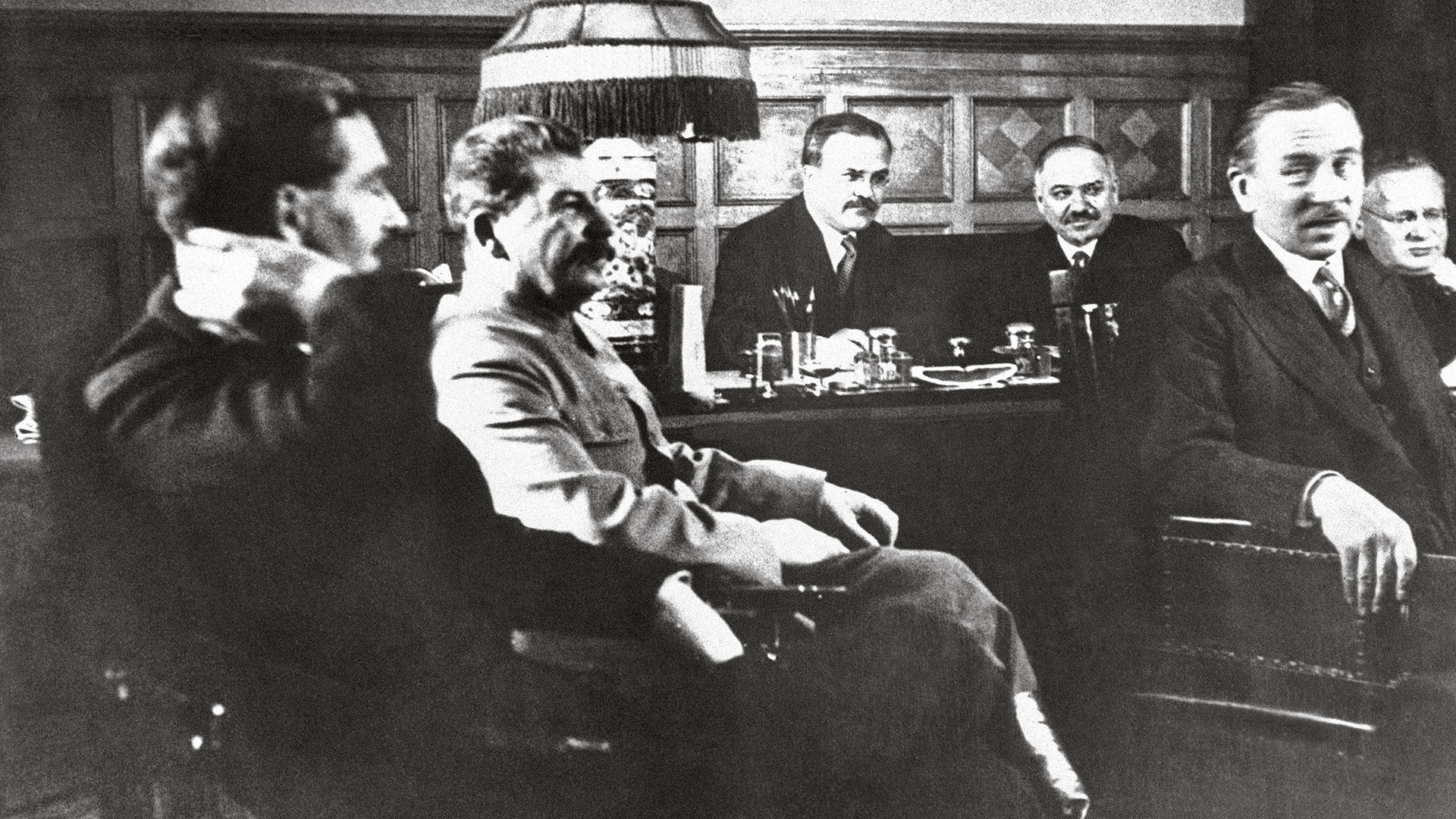 Οι κ.κ. Εντεν [φωτογραφία: σε πρώτο πλάνο] και Λιτβίνωφ μετέβησαν εις το Κρεμλίνον όπου ανέμενεν ο Στάλιν. Η συνομιλία Στάλιν – Εντεν εγένετο εις την μεγάλην αίθουσαν του Κρεμλίνου, επιπλωμένην με αυστηράν λιτότητα και επί των τοίχων της οποίας εκρέματο μεγάλη εικών του Καρλ Μαρξ, διήρκεσε δε επί μίαν ώραν.