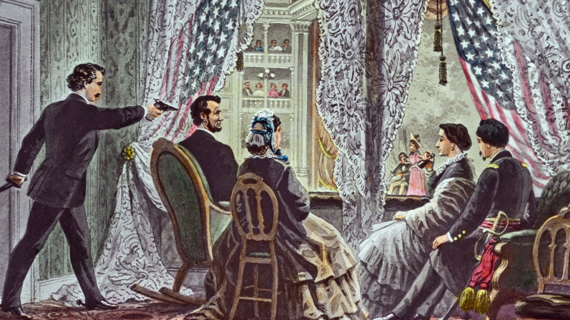 Ο Λίνκολν κάθισε σε μια κουνιστή πολυθρόνα και ξεκίνησε να παρακολουθεί την κωμωδία, κρατώντας το χέρι της συζύγου του. Κατά τη διάρκεια της παράστασης, η Μαίρη γελούσε συχνά με τα ευτράπελα του έργου και «πείραζε» τον σύζυγό της. Κάποια στιγμή τον ρώτησε αστειευόμενη «Τι θα σκεφτεί η δεσποινίς Χάρις [μία από τους καλεσμένους του προεδρικού ζεύγους] βλέποντάς με να σε κρατάω τόσο πολύ;». «Δεν θα σκεφτεί τίποτα», απάντησε ο Λίνκολν. Με βάση μεταγενέστερες μαρτυρίες, αυτά έμελλε να είναι τα τελευταία λόγια του 16ου Προέδρου των Ηνωμένων Πολιτειών.