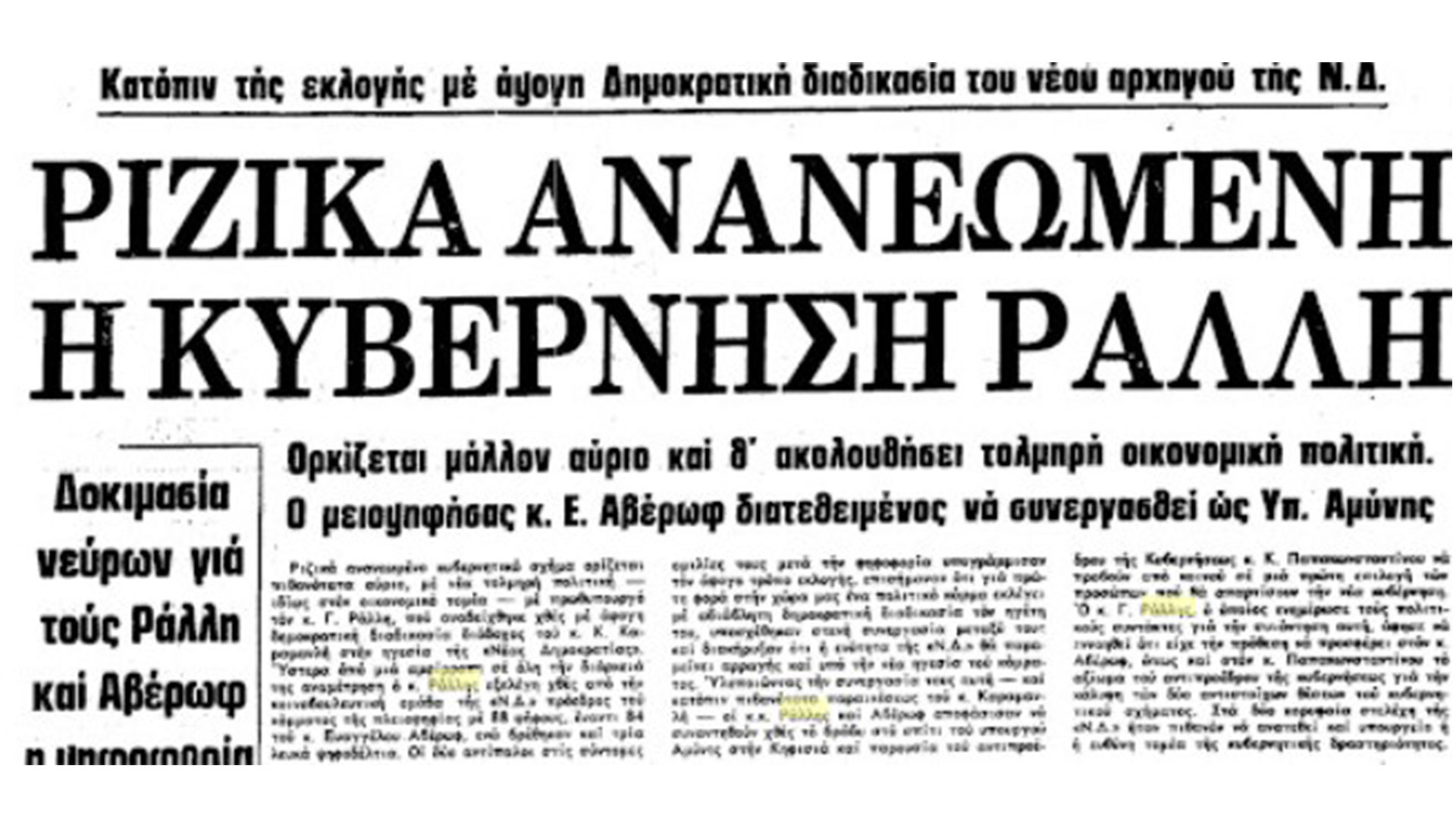 Ο Αβέρωφ εξέφραζε την τάση μιας πιο μαχητικής πολιτικής αντιπαράθεσης με το ΠΑΣΟΚ, ενώ ο Ράλλης ήταν υπέρμαχος της επικράτησης ήπιου πολιτικού κλίματος.