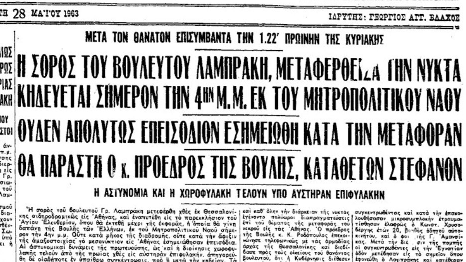 «Η σορός του βουλευτού Γρ. Λαμπράκη μετεφέρθη χθες εκ Θεσσαλονίκης σιδηροδρομικώς εις Αθήνας, και εναπετέθη εις το παρεκκλήσιον του Αγίου Ελευθερίου, όπου θα εκτεθή μέχρι της εκφοράς, η οποία θα γίνη δαπάνη της Βουλής των Ελλήνων, εκ του Μητροπολιτικού Ναού σήμερον την 4ην μ.μ. Ούτε κατά μήκος της διαδρομής, ούτε κατά την άφιξιν της αμαξοστοιχίας το μεσονύκτιον εις Αθήνας εσημειώθησαν επεισόδια», έγραφε η «Καθημερινή» στο πρωτοσέλιδο της 28ης Μαΐου. «Αι αστυνομικαί δυνάμεις της πρωτευούσης, ως και η διοίκησις χωροφυλακής τελούν από της πρωΐας χθες εις αυστηράν επιφυλακήν, απηγορεύθη δε οιαδήποτε εν υπαίθρω συγκέντρωσις, προ ή μετά την κηδεία. Τα περί επιφυλακής και του στρατού διεψεύσθησαν».