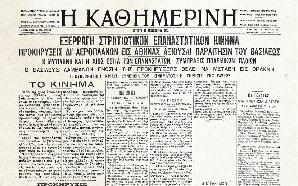 Οι πρώτες ενέργειες για την εκδήλωση ενός κινήματος έγιναν από τον βενιζελικό συνταγματάρχη Νικόλαο Πλαστήρα, ενώ ο ελληνικός στρατός βρισκόταν ακόμη στη Μικρά Ασία. Ωστόσο, το Κίνημα του Στρατού και του Ναυτικού ξέσπασε στις 11 Σεπτεμβρίου 1922 στη Χίο και στη Λέσβο με επικεφαλής τον Πλαστήρα, τον συνταγματάρχη Στυλιανό Γονατά και τον αντιπλοίαρχο Δημήτριο Φωκά, ο οποίος εκπροσωπούσε τις μονάδες του Ναυτικού. Την επομένη οι κινηματίες επιβιβάστηκαν σε εμπορικά και πολεμικά πλοία με προορισμό την ελληνική πρωτεύουσα. Στις 14 Σεπτεμβρίου, ο Κωνσταντίνος Α΄ παραιτήθηκε υπέρ του πρωτότοκου γιου του Γεωργίου Β΄, υποκύπτοντας στο τελεσίγραφο των κινηματιών.