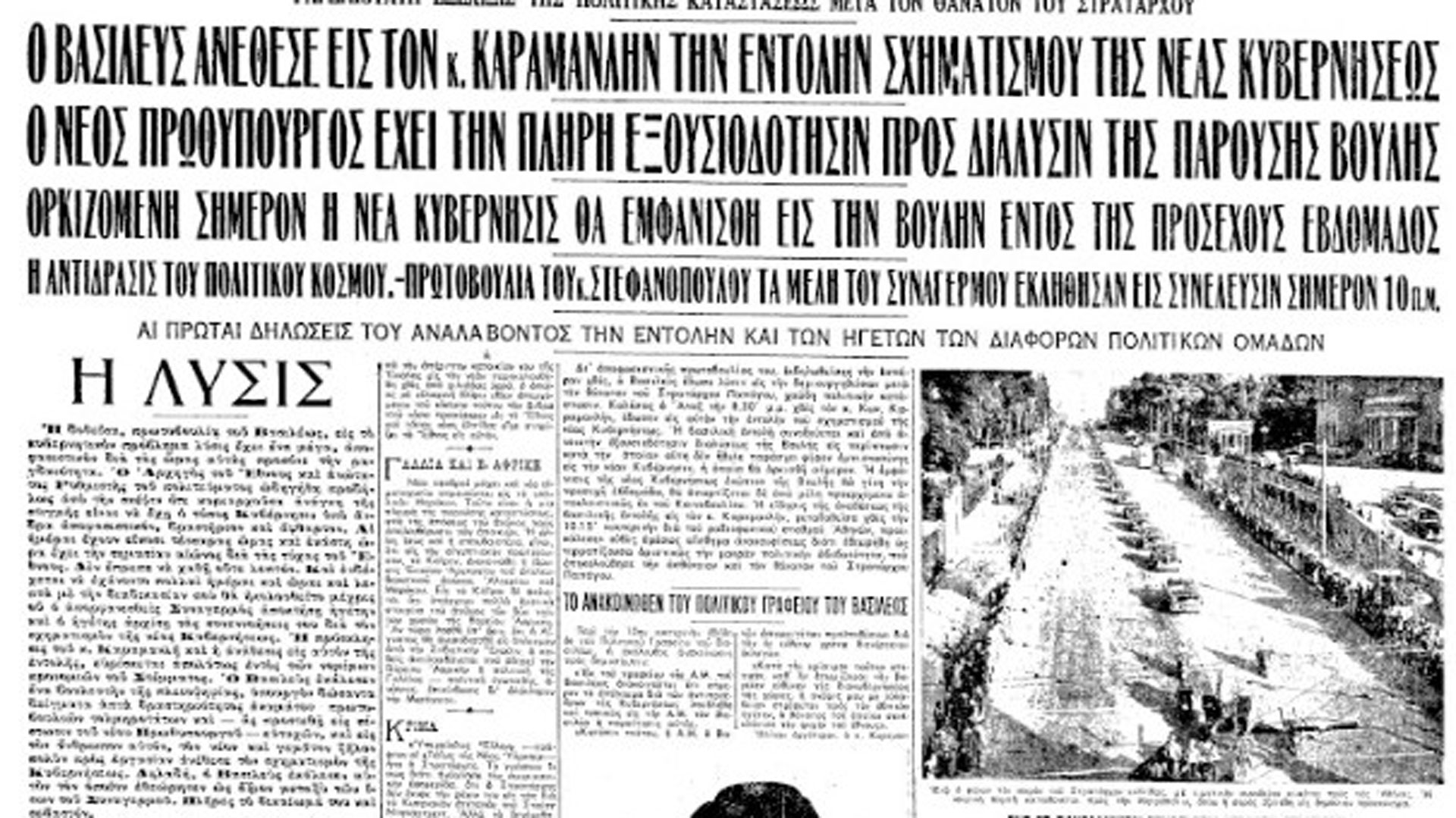 «Δι’ αποφασιστικής πρωτοβουλίας του, εκδηλωθείσης την εσπέραν χθες, ο Βασιλεύς έδωσε λύσιν εις την δημιουργηθείσαν μετά τον θάνατον του Στρατάρχου Παπάγου, χαώδη πολιτικήν κατάστασιν», έγραφε στο πρωτοσέλιδό της η «Κ», στις 6 Οκτωβρίου. «Καλέσας ο Αναξ την 8.30΄ μ.μ. χθες τον κ. Κων. Καραμανλήν, έδωσεν εις αυτόν την εντολήν του σχηματισμού της νέας Κυβερνήσεως. Η βασιλική εντολή συνοδεύεται και από ανοικτήν εξουσιοδότησιν διαλύσεως της Βουλής εις περίπτωσιν κατά την οποίαν αύτη δεν ήθελε παράσχει ψήφον εμπιστοσύνης εις την νέαν Κυβέρνησιν, η οποία θα ορκισθή σήμερον. Η εμφάνισις της νέας Κυβερνήσεως ενώπιον της Βουλής θα γίνη την προσεχή εβδομάδα, θα απαρτίζεται δε από μέλη προερχόμενα αποκλειστικώς εκ του Κοινοβουλίου. Η είδησις της αναθέσεως της βασιλικής εντολής εις τον κ. Καραμανλήν, μεταδοθείσα χθες την 10.15΄ νυκτερινήν διά του ραδιοφωνικού σταθμού Αθηνών, προεκάλεσεν ευθύς αμέσως αίσθημα ανακουφίσεως διότι εθεωρήθη ως τερματίζουσα οριστικώς την μακράν πολιτικήν αβεβαιότητα, που επηκολούθησε την ασθένειαν και τον θάνατον του Στρατάρχου Παπάγου».