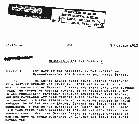Στις 7 Οκτωβρίου 1940, σε μια στιγμή που ο Β’ Παγκόσμιος Πόλεμος είχε ήδη εξαπλωθεί στην Ευρώπη και η Ασία βρισκόταν στη δίνη του ιαπωνικού επεκτατισμού, ο αξιωματικός του Αμερικανικού Ναυτικού Aρθουρ Χ. ΜακΚόλουμ, επικεφαλής του τμήματος Απω Ανατολής στο Γραφείο Ναυτικών Πληροφοριών, συνέταξε ένα εμπιστευτικό υπόμνημα.