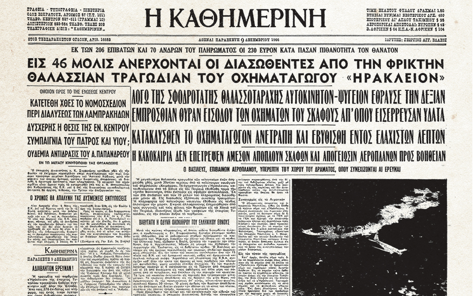 Οι πρώτες ημέρες του Δεκεμβρίου του 1966 έβρισκαν την Ελλάδα στη δίνη της χειμωνιάτικης κακοκαιρίας. Τα ξημερώματα της 8ης Δεκεμβρίου, στο φουρτουνιασμένο Μυρτώο Πέλαγος, έλαβε χώρα μία από τις μεγαλύτερες ναυτικές τραγωδίες της χώρας. «Η μεγαλυτέρα θαλασσία τραγωδία των τελευταίων ετών εσημειώθη χθες, μετά 20ετίαν περίπου από το πολύνεκρον ναυάγιον του ατμοπλοίου “Χειμάρρα”. Το οχηματαγωγόν “Ηράκλειον” κατευθυνόμενον από τα Χανιά εις τον Πειραιά εβυθίσθη παρά την νησίδα Φαλκονέρα, όπου ενέπεσεν εις σφοδρόν αντικυκλώνα», έγραφε η «Καθημερινή» στις 9 Δεκεμβρίου.