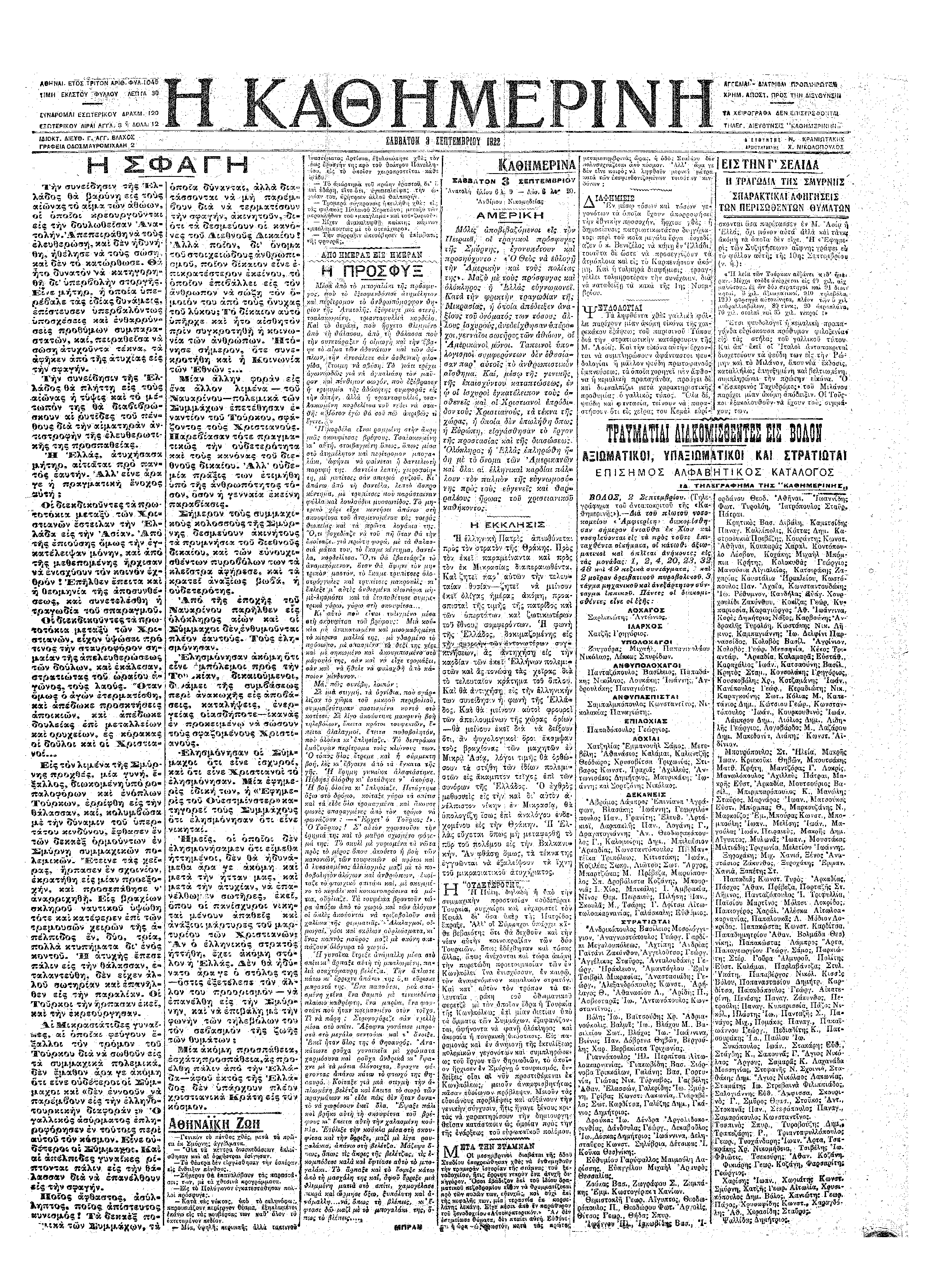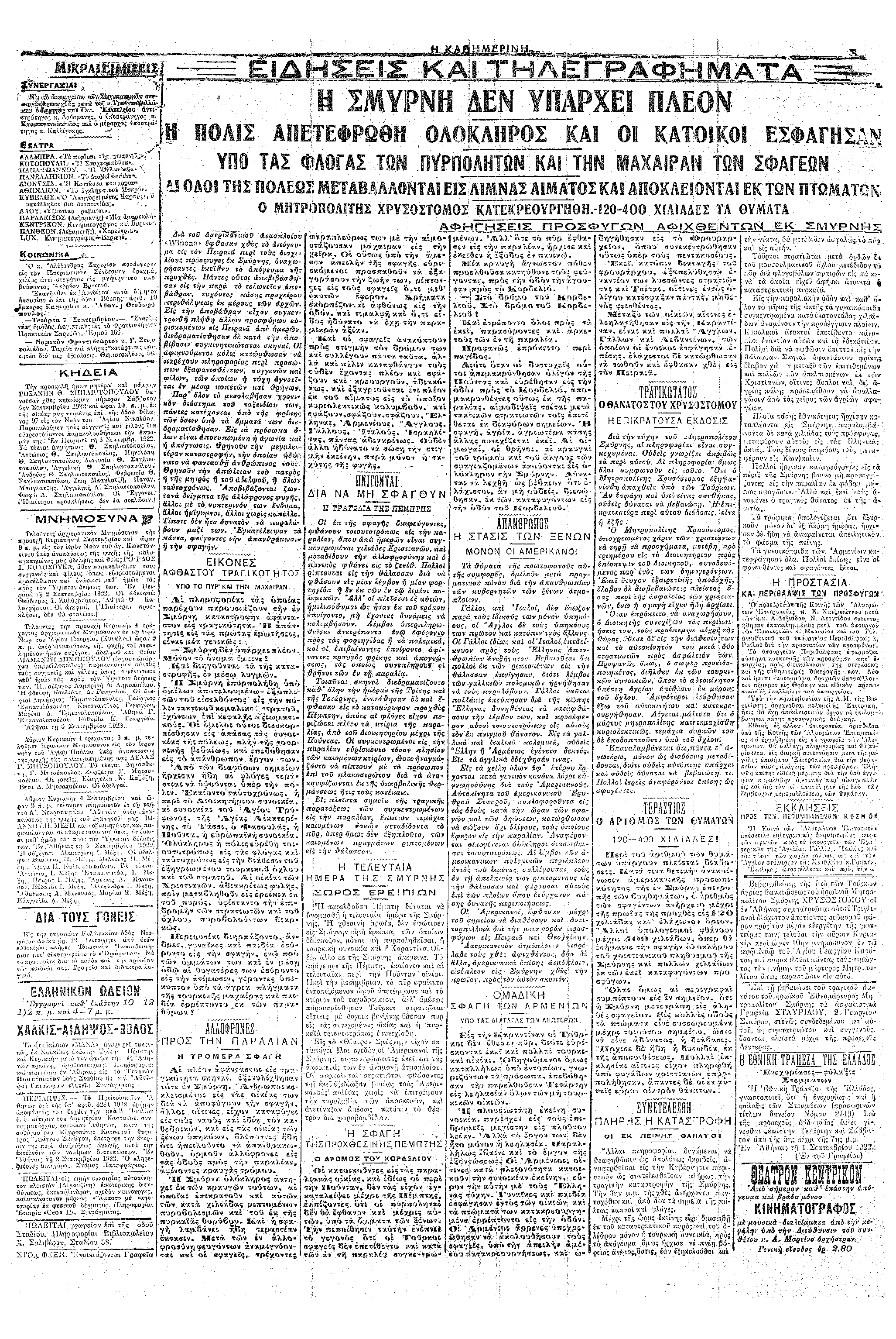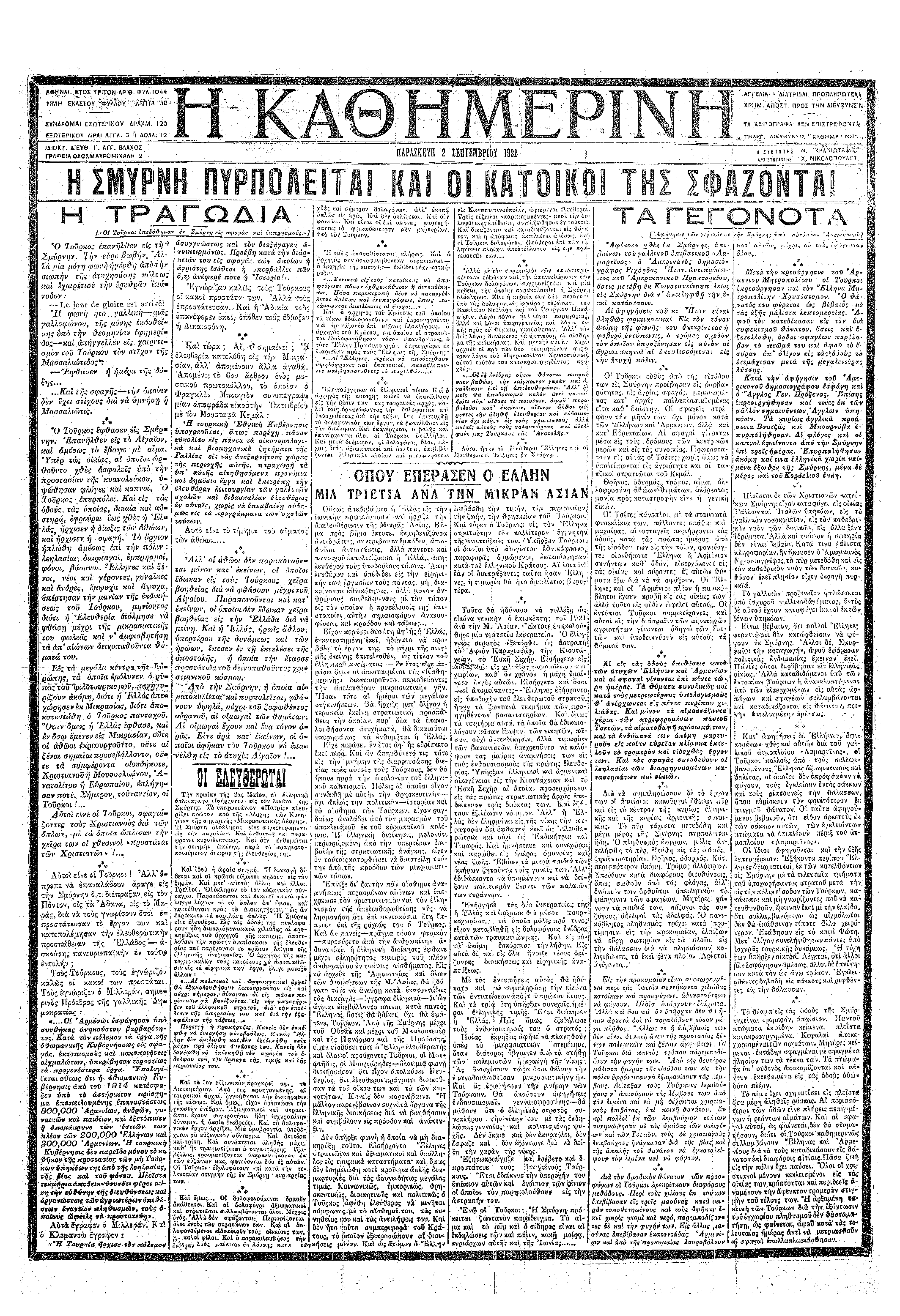 «Ο Τούρκος έφθασεν εις Σμύρνην. Επανήλθεν εις το Αιγαίον και αμέσως το έβαψε με αίμα. Υπέρ τας οικίας, αι οποίαι ωρθούντο χθες ασφαλείς υπό την προστασίαν της κυανόλευκου, υψώθηκαν φλόγες και καπνοί. Ο Τούρκος επυρπόλει. Και εις τας οδούς, τας οποίας, δικαία και αυστηρά, εφρούρει έως χθες η Ελλάς, ήρχισεν η δίωξις των αθώων, και ήρχισεν η σφαγή. Το όργιον ηπλώθη αμέσως επί την πόλιν: λεηλασίαι, διαρπαγαί, εμπρησμοί, φόνοι, βάσανοι. Έλληνες και ξένοι, νέοι και γέροντες, γυναίκες και άνδρες, έμψυχα και άψυχα, υπέστησαν την μανίαν του Τούρκου, μηνίοντος διότι η Ελευθερία ετόλμησε να φθάση μέχρι της μικρασιατικής του φωλεάς και ν’ αμφισβητήση τα απ’ αιώνων δεινοπαθούντα θύματά του.»
