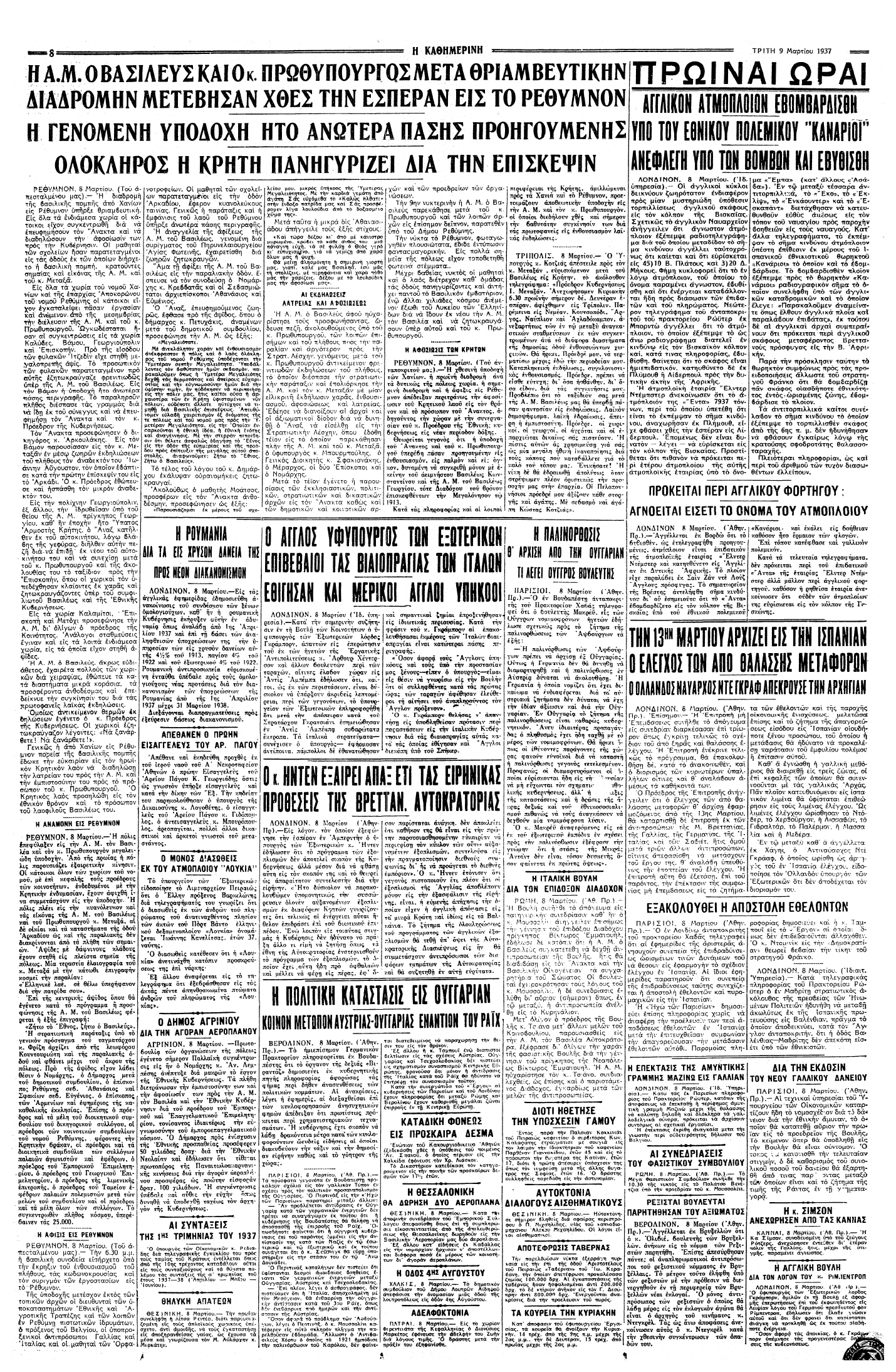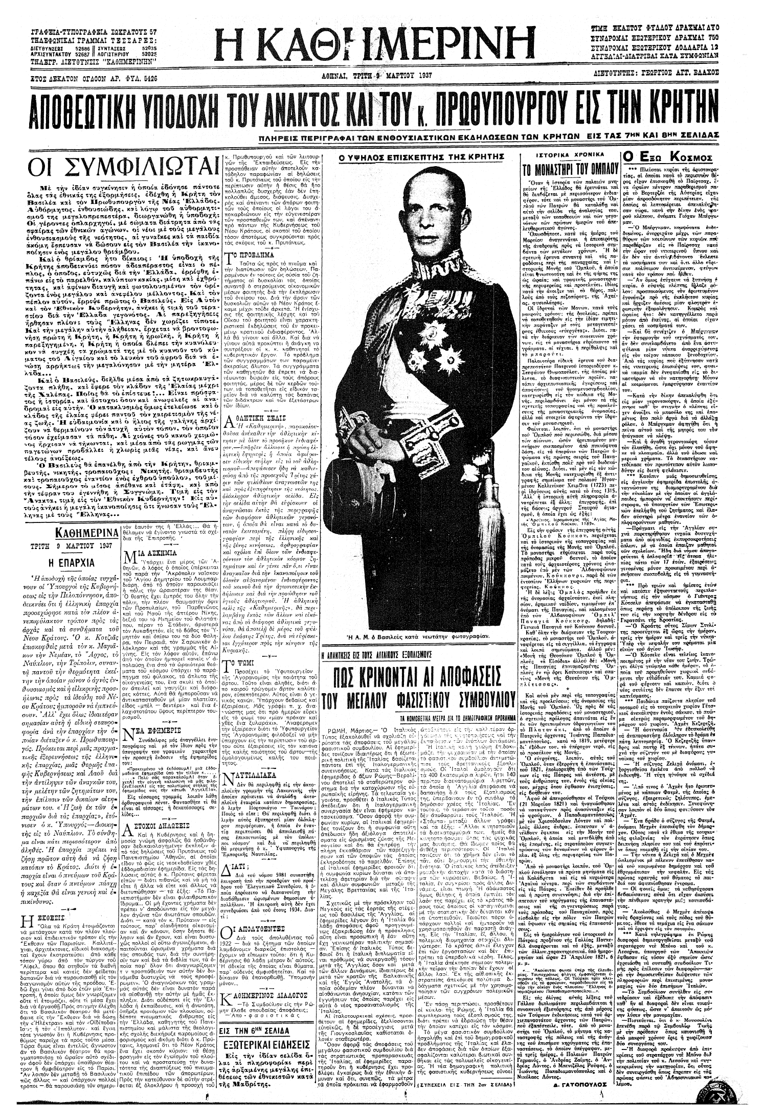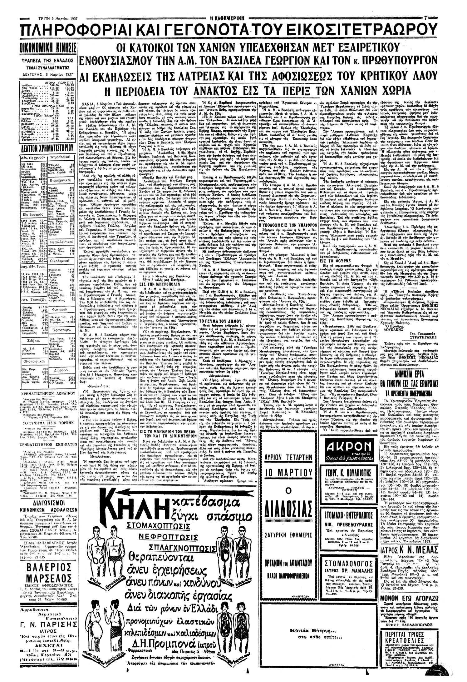 «Οι κάτοικοι των Χανίων και οι συρρεύσαντες ενταύθα κατά χιλιάδας εκ των άλλων πόλεων της νήσου και των χωρίων του εσωτερικού, υπεδέχθησαν χθες την πρωίαν εν εξάλλω ενθουσιασμώ την Α.Μ. τον Βασιλέα και τον Πρόεδρον της Κυβερνήσεως κ. Μεταξάν. Η πόλις είχε προσλάβει την εορτάσιμον όψιν μεγάλου ιστορικού γεγονότος. Αι οικίαι και τα καταστήματα είχον σημαιοστολισθή, εις τους εξώστας δε είχον αναρτηθή μεγάλαι εικόνες της Α.Μ. του Βασιλέως και του κ. Πρωθυπουργού πλαισιούμεναι με δάφνας. Εις διάφορα σημεία της πόλεως οπόθεν θα διήρχοντο οι επίσημοι είχον στήθη μεγαλοπρεπείς αψίδες με χαιρετηστηρίους επιγραφάς.»