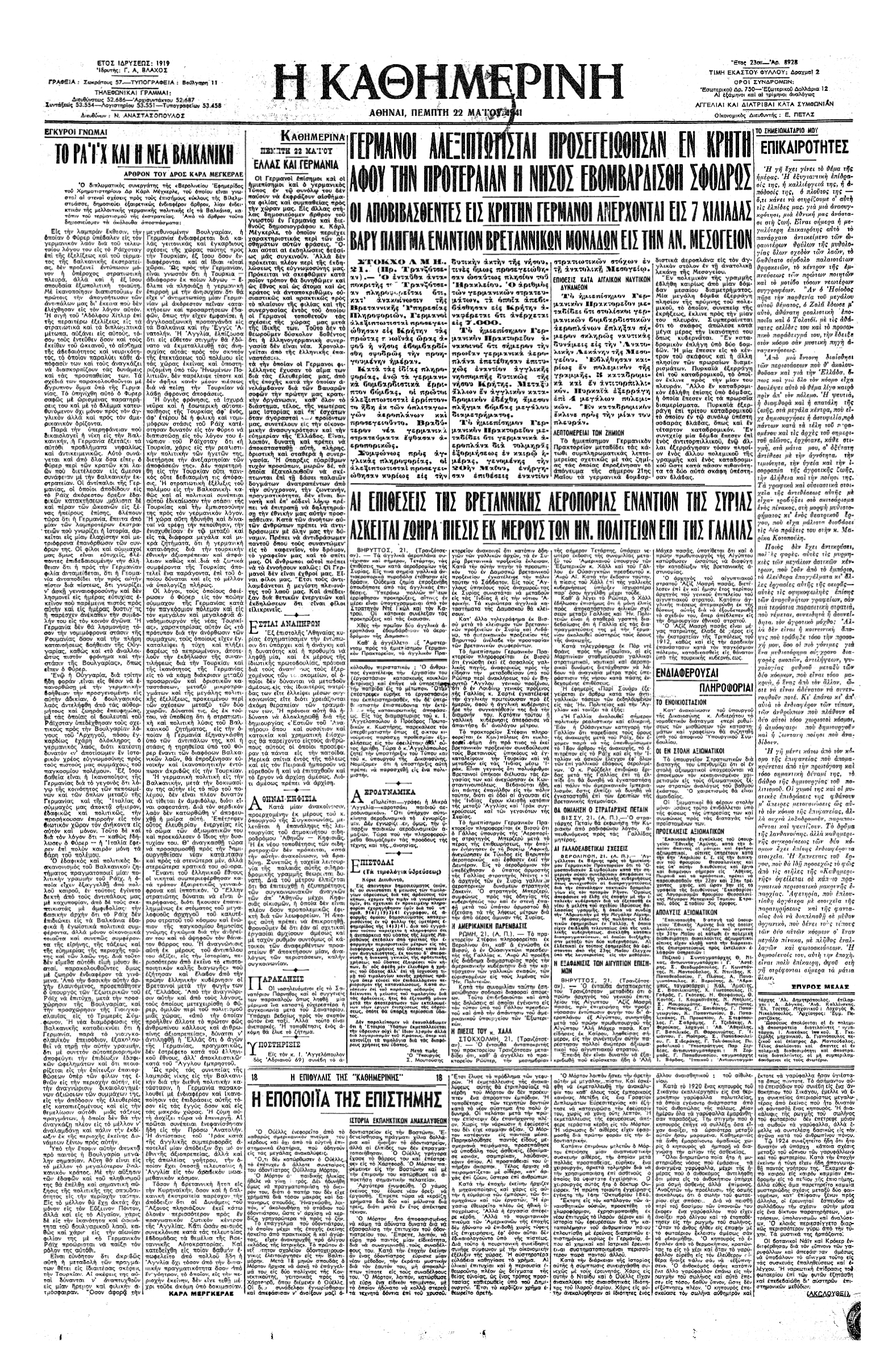 «Κατ’ ανακοίνωσιν της Βρεταννικής Υπηρεσίας Πληροφοριών, Γερμανοί αλεξιπτωτισταί προσεγειώθησαν εις Κρήτην τας πρώτας πρωϊνάς ώρας αφού η νήσος εβομβαρδίσθη σφοδρώς την προηγουμένην ημέραν. Κατά τας ιδίας πληροφορίας, ενώ τα γερμανικά βομβαρδιστικά έρριπτον βόμβας, οι πρώτοι αλεξιπτωτισταί ερρίπτοντο ήδη εκ των οπλιταγωγών αεροπλάνων και προσεγειούντο. Βραδύτερον νέα γερμανικά στρατεύματα έφθασαν αεροπορικώς. Συμφώνως προς αγγλικάς πληροφορίας, οι αλεξιπτωτισταί προσεγειώθησαν κυρίως εις την δυτικήν ακτήν της νήσου, τινές όμως προσεγειώθησαν ωσαύτως πλησίον του Ηρακλείου [...]».