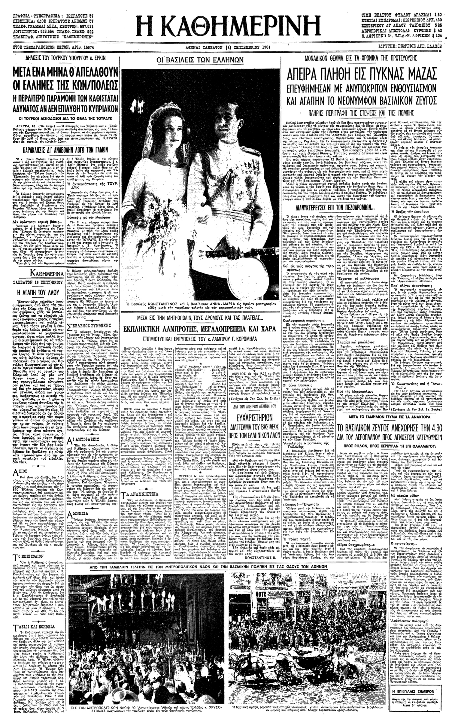 «Πολλαί εκατοντάδες χιλιάδων λαού εις ένα άνευ προηγουμένου συναγερμόν κατέκλυσαν χθες το κέντρον της πρωτευούσης διά να ίδουν, να επευφημήσουν και να ευχηθούν το νεόνυμφον βασιλικόν ζεύγος. […] Εις εν εκατομμύριον υπελόγισεν η αστυνομία το πλήθος που κατέκλυσε την περιοχήν διά να ίδη την πομπήν των πρώτων γάμων Έλληνος Βασιλέως εις τας Αθήνας. […] Αλλά η πλέον συγκινητική στιγμή υπήρξεν εκείνη κατά την οποίαν, μετά το γεύμα, η νέα Βασίλισσα εξέφρασε την επιθυμίαν όπως άμα τη αναχωρήσει της διά το γαμήλιον ταξίδιον, η γαμήλιος ανθοδέσμη της εναποτεθή επί του τάφου του αειμνήστου Βασιλέως Παύλου.»