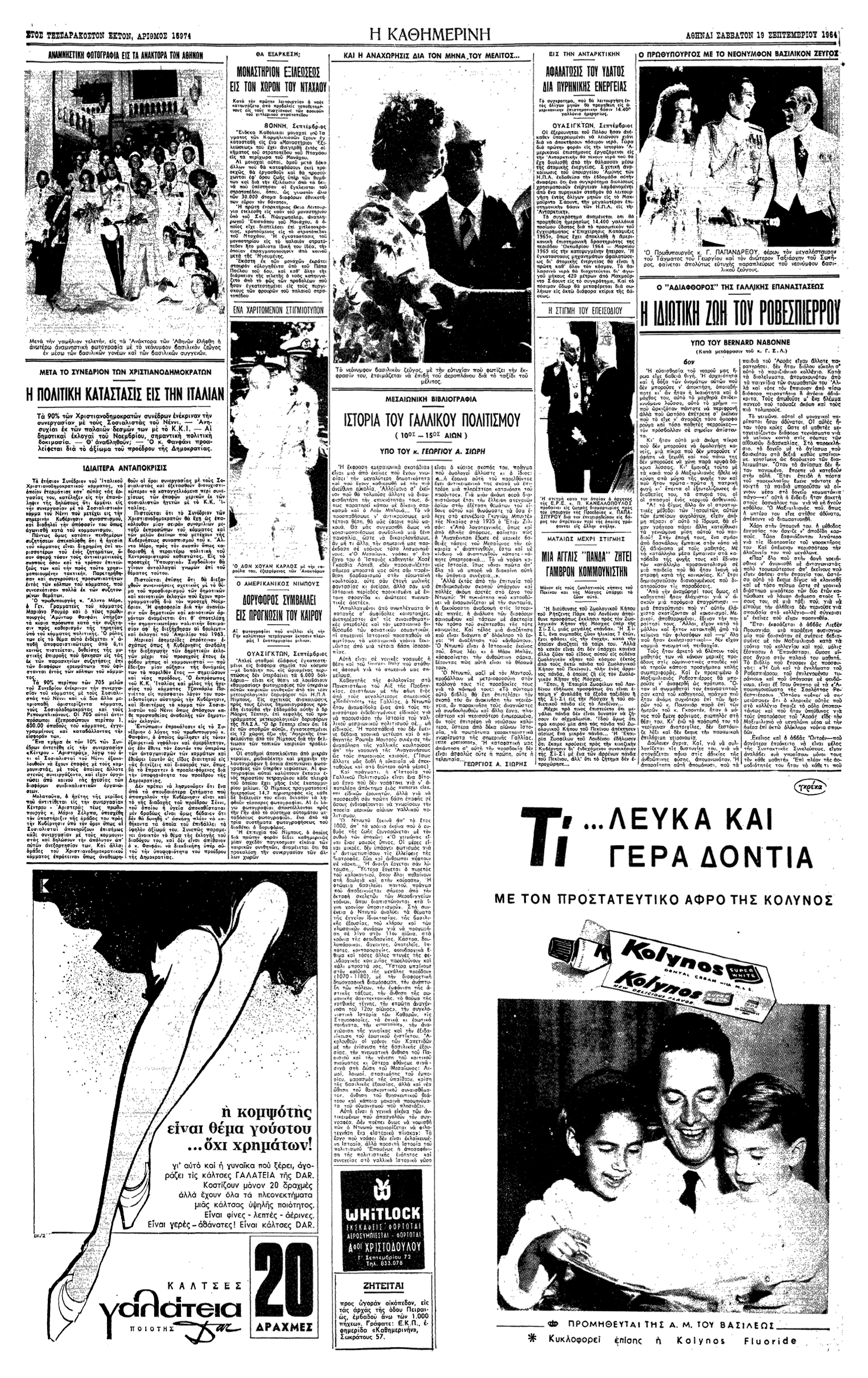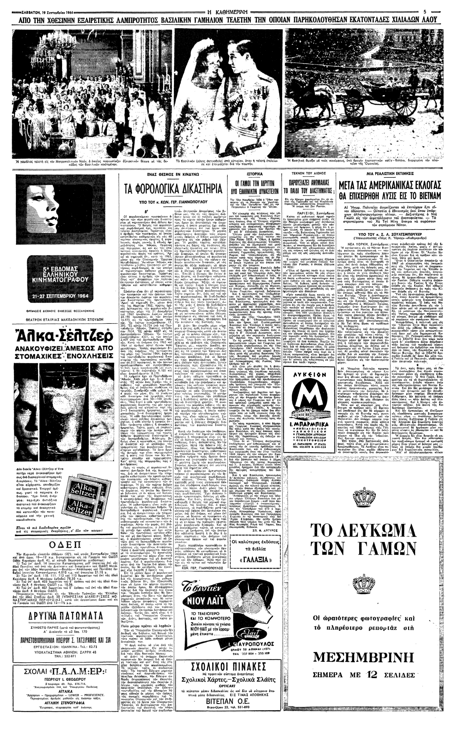 Γίνεται στην Αθήνα ο γάμος του βασιλιά των Ελλήνων Κωνσταντίνου Β΄ και της Δανής πριγκίπισσας Άννας-Μαρίας. Ήταν ο πρώτος και ο τελευταίος επίσημος γάμος εν ενεργεία μονάρχη που έγινε στην Ελλάδα. Τη λαμπρή γαμήλια τελετή -ξεκίνησε στις 10 π.μ. στη Μητρόπολη Αθηνών- παρακολούθησαν 1.200 προσκεκλημένοι, ανάμεσά τους 18 βασιλείς, 7 διάδοχοι θρόνων, 2 βασιλικοί σύζυγοι, 103 πρίγκιπες και πριγκίπισσες, καθώς και 20 δούκες και κόμητες.
