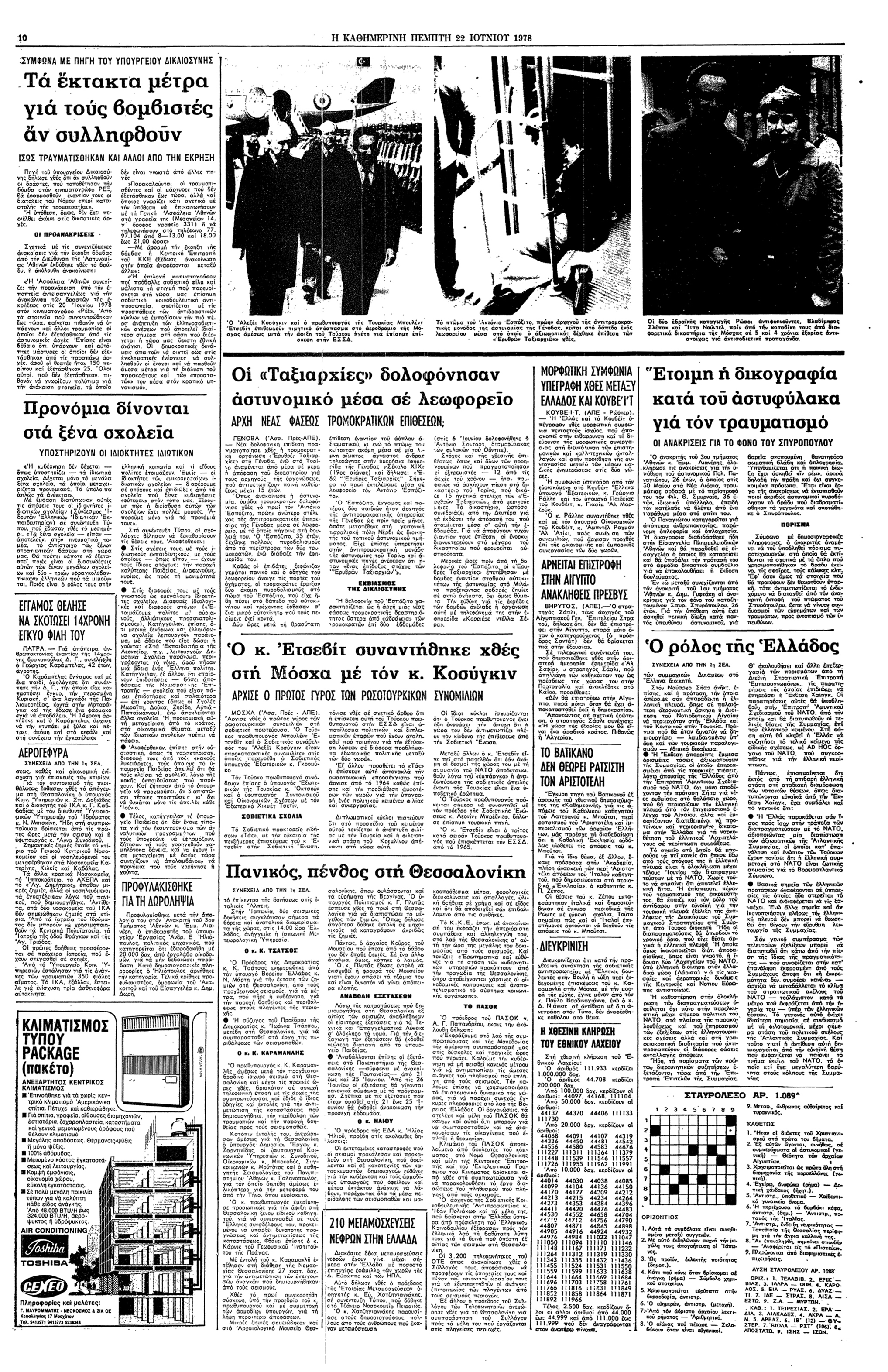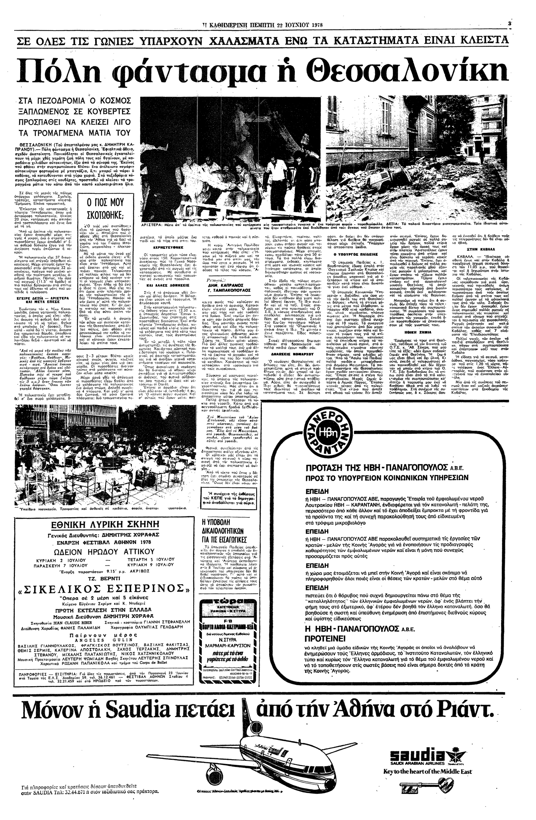 «[...] Την στιγμή αυτή ο εξακριβωμένος αριθμός των νεκρών είναι 19, των αγνοουμένων –ενοίκων της μοιραίας πολυκατοικίας– 24 και των τραυματιών μεταξύ 130 και 150. Τον πανικό των κατοίκων, τόσο δικαιολογημένο από την τρομακτική ένταση του σεισμού, επέτειναν οι μετασεισμικές δονήσεις που συνεχίσθηκαν και χθες και τρομοκράτησαν και γειτονικές πόλεις, όπως οι Σέρρες, η Καβάλα, η Ξάνθη. Η σεισμική δόνηση άρχισε στις 11.5' της νύχτας της Τρίτης και βρήκε τον περισσότερο κόσμο στα σπίτια του, καθώς είχε σχεδόν πεισθεί ότι οι μετασεισμικές αναταραχές των τελευταίων ημερών είχαν εξασθενήσει αρκετά. Έτσι εκατοντάδες χιλιάδες ανθρώπων πετάχτηκαν στους δρόμους όπου άκουγαν έντρομοι τις πληροφορίες για την κατάρρευση μιας πολυκατοικίας, τις καταρρεύσεις πολλών μικρών σπιτιών, για τις ρωγμές και τα θύματα.»