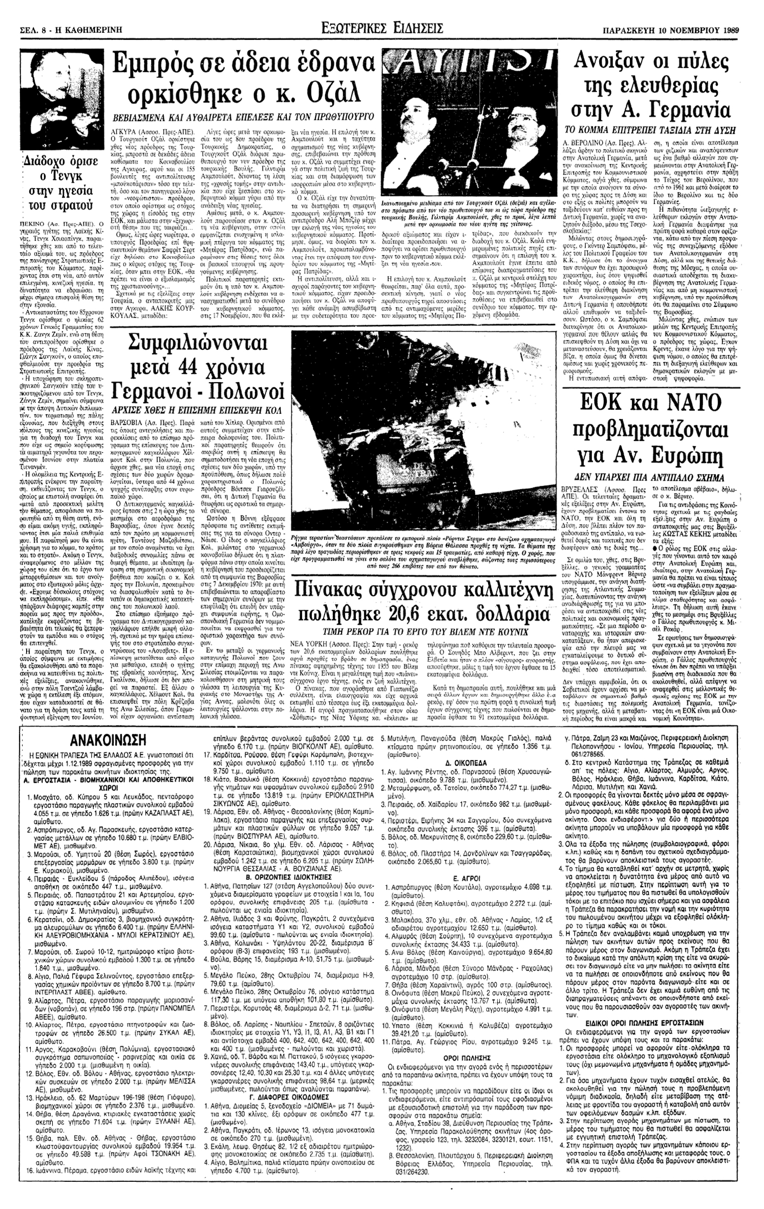 «Η αντίστροφη μέτρηση για την κατεδάφιση του Τείχους του Βερολίνου, του πιο μισητού και πιο απάνθρωπου σημείου διαχωρισμού ανάμεσα στη μια Γερμανία και την άλλη, ανάμεσα στην Ανατολή και τη Δύση, άρχισε αργά χθες το βράδυ. Υποκύπτοντας στη “φωνή του λαού”, πριν αυτή γίνει “οργή Θεού”, που θα στρεφόταν εναντίον του, ο νέος ηγέτης του Βερολίνου Έγκον Κρεντς άνοιξε τα σύνορα της χώρας του –που, έτσι κι αλλιώς ήταν “διάτρητα”, μετά τη φυγή χιλιάδων Ανατολικογερμανών στη Δύση…– σε όσους θέλουν ακόμη να φύγουν, για λίγο ή για πολύ.»