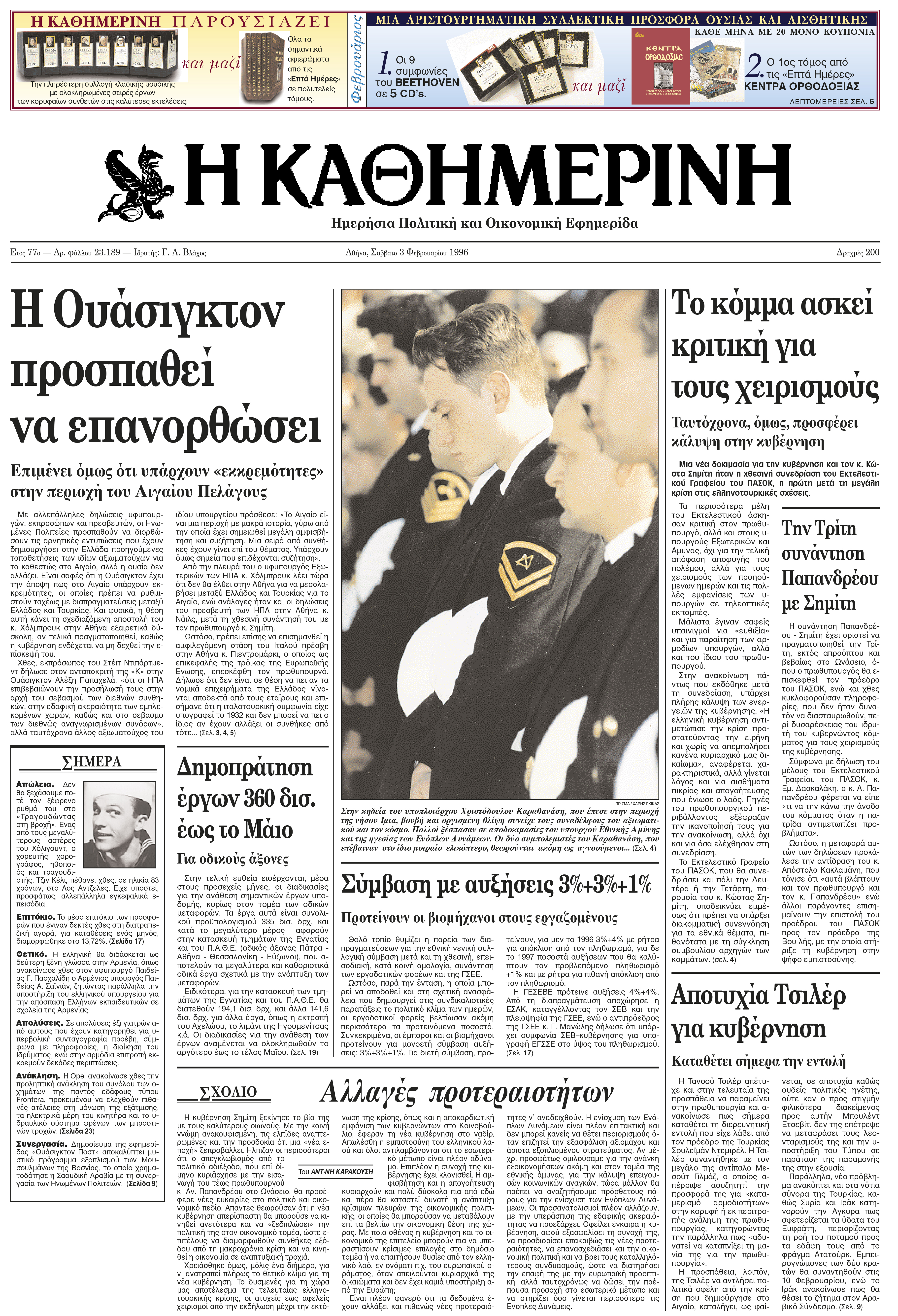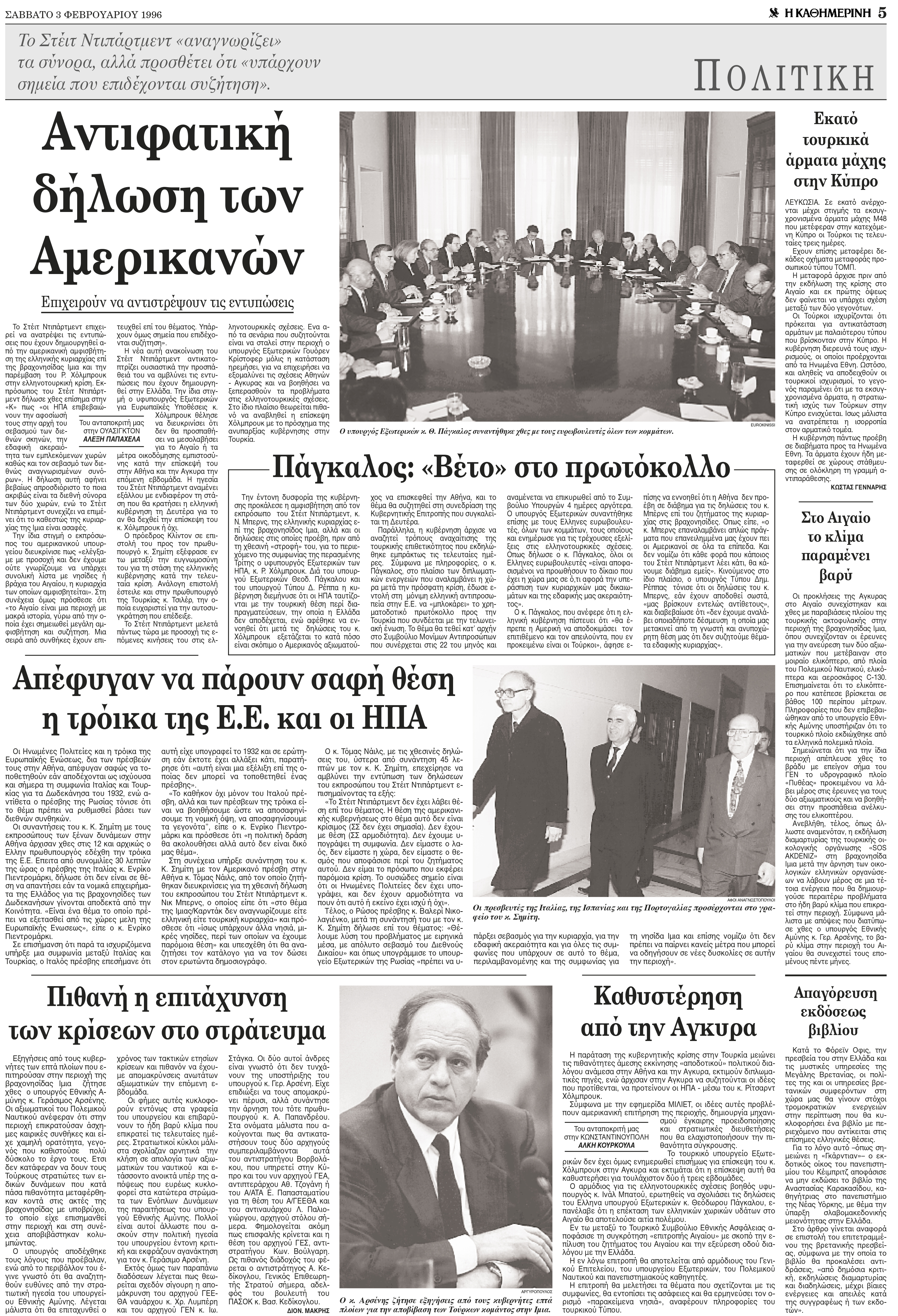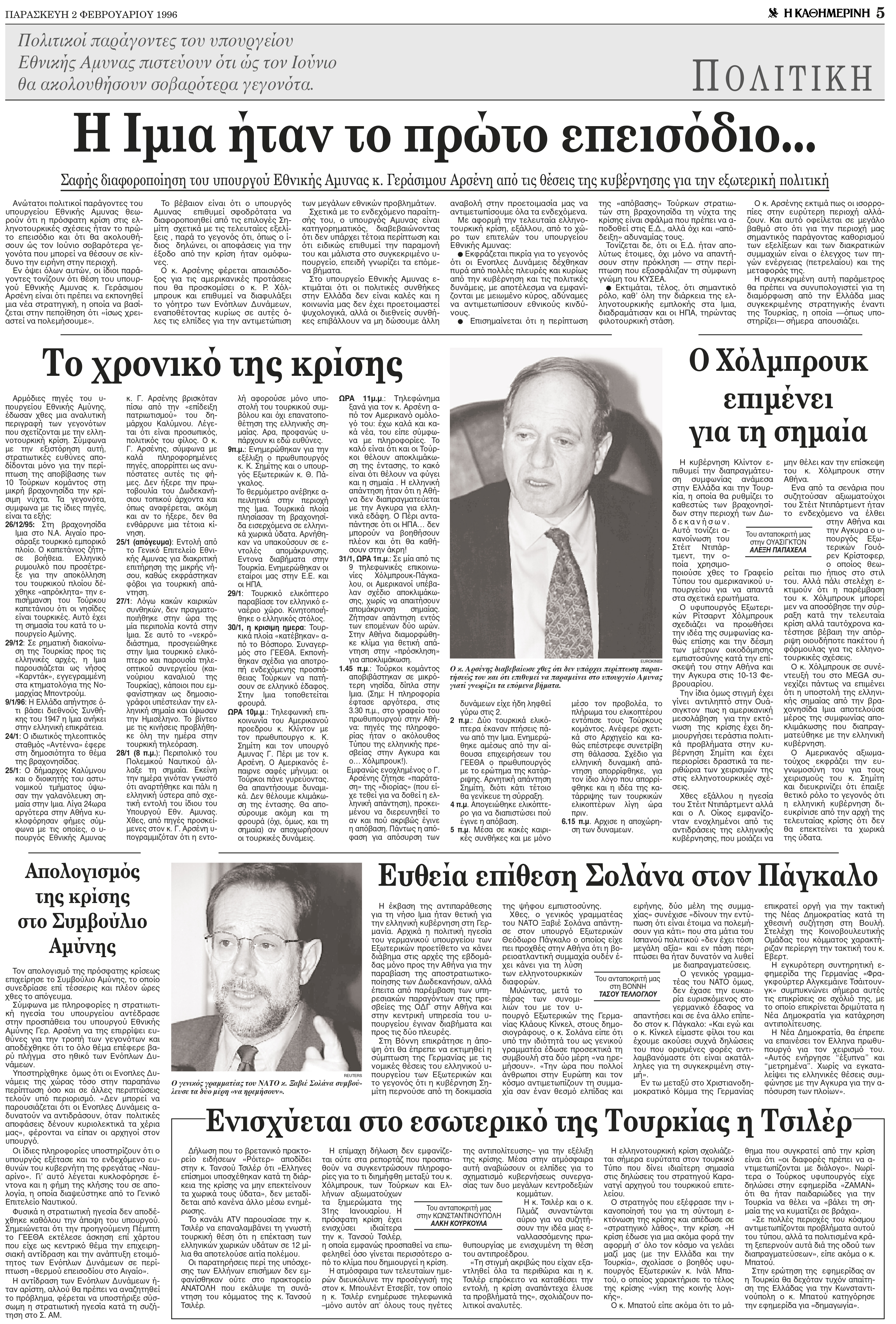 «Όλες οι εκτιμήσεις συγκλίνουν στο συμπέρασμα ότι η κρίση που προκάλεσε η τουρκική επεκτατική πολιτική με αφορμή τις βραχονησίδες Ίμια θα έχει και συνέχεια, που δεν αποκλείεται κάποια στιγμή να πάρει διαστάσεις ανοιχτής πολεμικής σύγκρουσης, και γι’ αυτό το λόγο απαιτείται να διατηρηθεί η συνοχή της κυβέρνησης και η επίδειξη πνεύματος σύνεσης και ψυχραιμίας. […] Οι πληροφορίες αναφέρουν ότι ο υπουργός Εθνικής Άμυνας κ. Γεράσιμος Αρσένης θεωρεί ότι η Ελλάδα δεν θα αποφύγει τη σύγκρουση με την Τουρκία, και φέρεται αποφασισμένος να πιέσει για την καλύτερη προετοιμασία της χώρας σε όλους τους τομείς. Κατά τις ίδιες πληροφορίες, ο κ. Γ. Αρσένης πιστεύει ότι οι ΗΠΑ ενθαρρύνουν έμμεσα, αλλά σαφώς τις επεκτατικές βλέψεις της Άγκυρας, καθώς στις παραμέτρους που καθορίζουν τη σημασία της περιοχής είναι ο έλεγχος των πηγών ενέργειας και της μεταφοράς τους.»