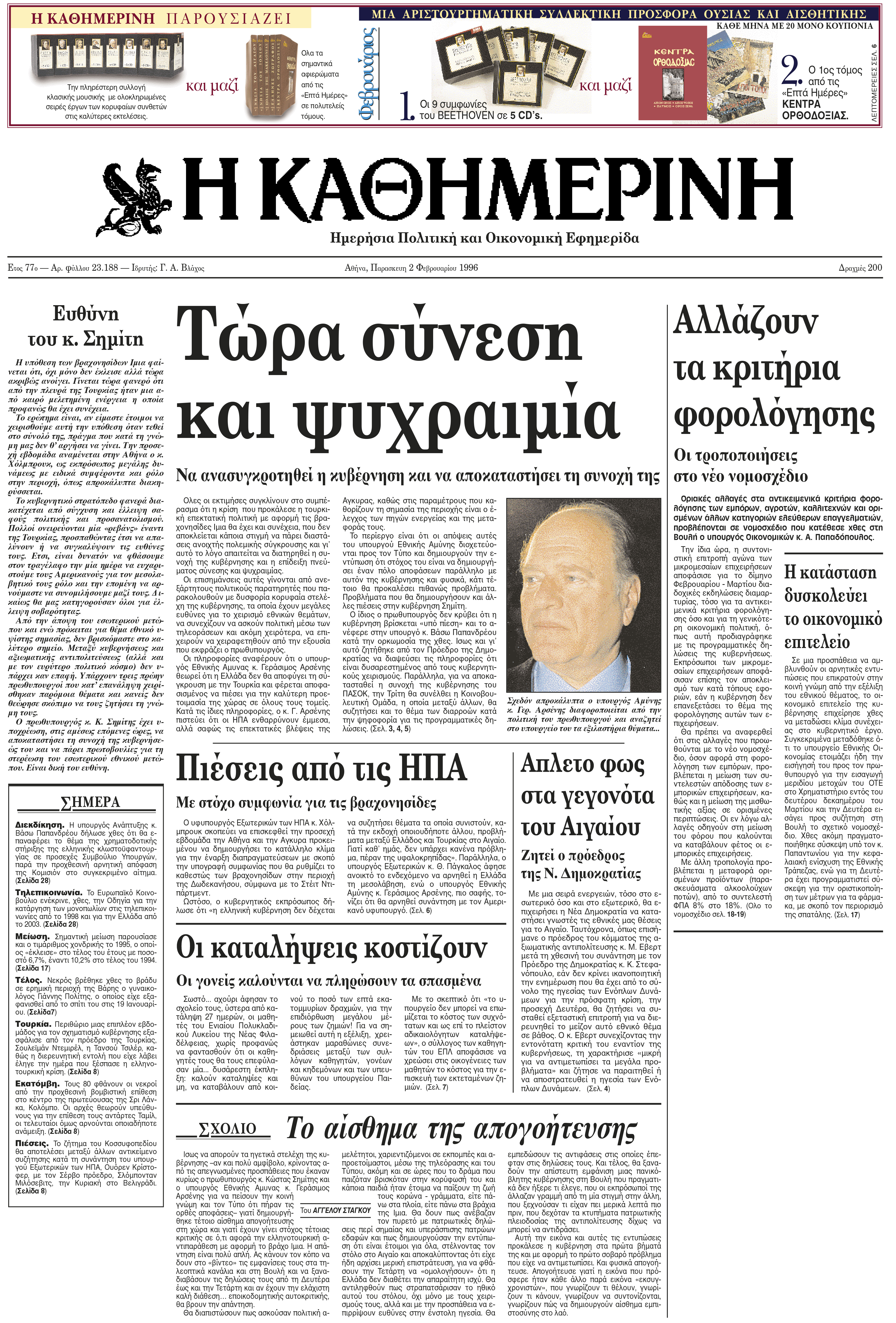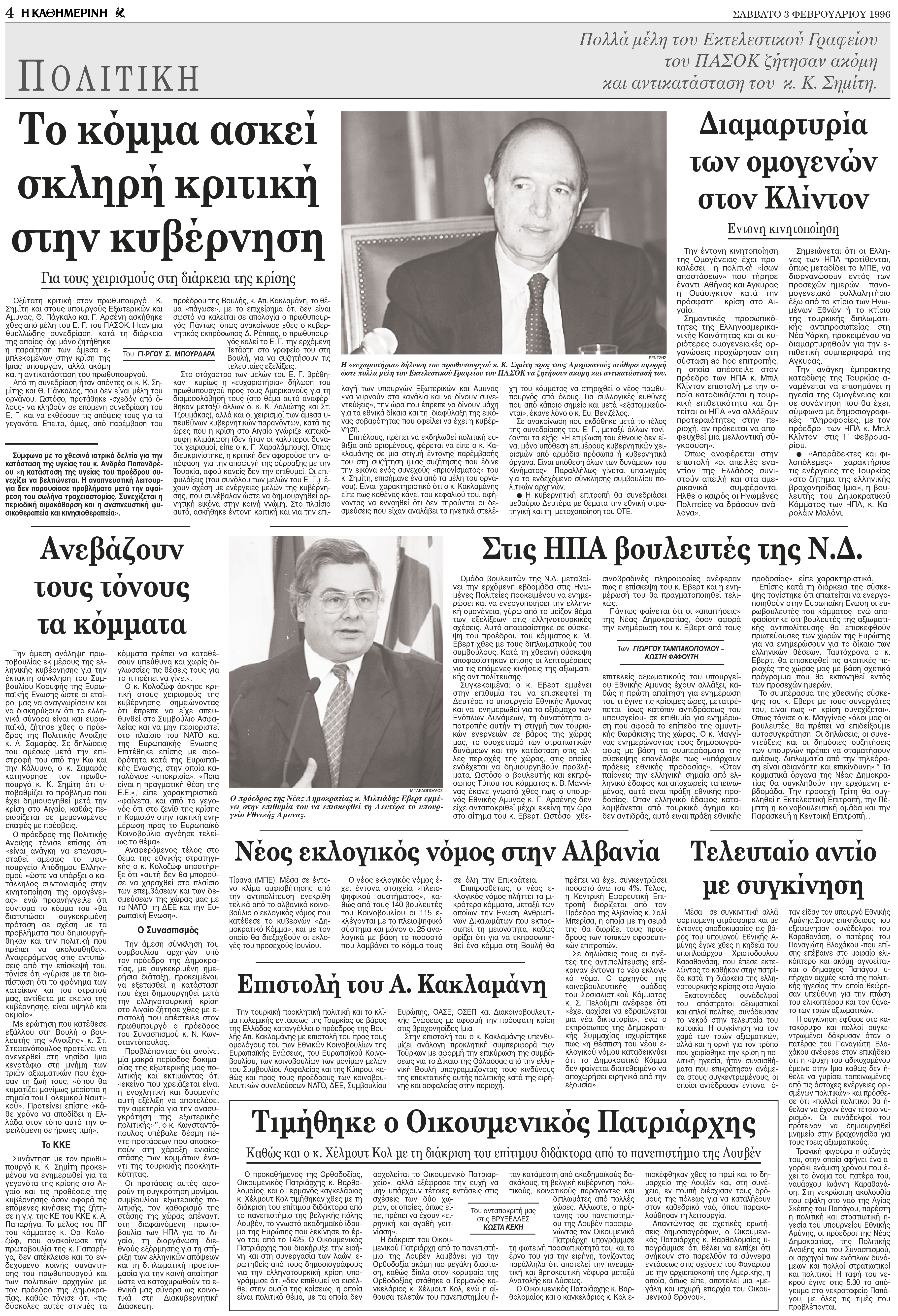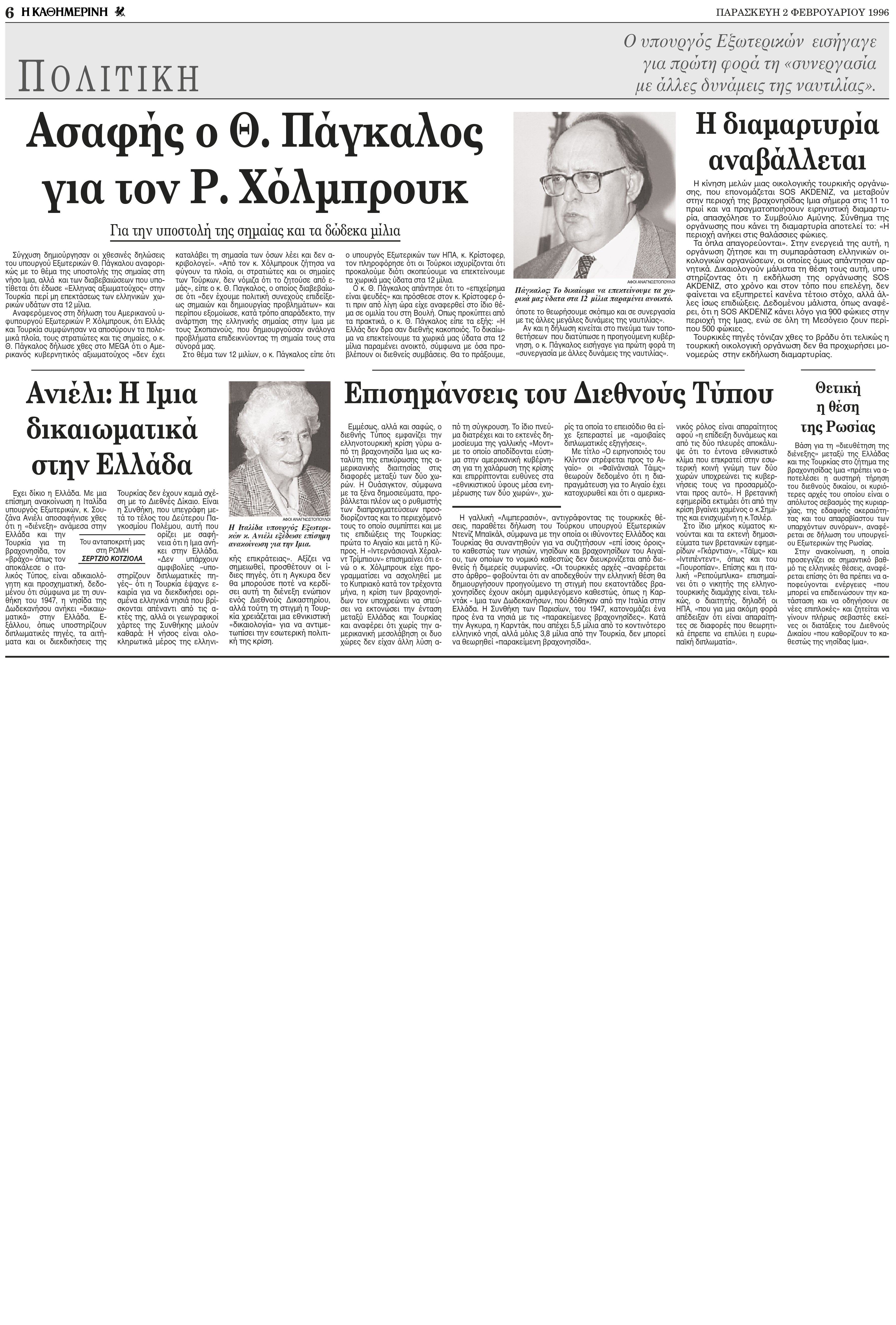 «Όλες οι εκτιμήσεις συγκλίνουν στο συμπέρασμα ότι η κρίση που προκάλεσε η τουρκική επεκτατική πολιτική με αφορμή τις βραχονησίδες Ίμια θα έχει και συνέχεια, που δεν αποκλείεται κάποια στιγμή να πάρει διαστάσεις ανοιχτής πολεμικής σύγκρουσης, και γι’ αυτό το λόγο απαιτείται να διατηρηθεί η συνοχή της κυβέρνησης και η επίδειξη πνεύματος σύνεσης και ψυχραιμίας. […] Οι πληροφορίες αναφέρουν ότι ο υπουργός Εθνικής Άμυνας κ. Γεράσιμος Αρσένης θεωρεί ότι η Ελλάδα δεν θα αποφύγει τη σύγκρουση με την Τουρκία, και φέρεται αποφασισμένος να πιέσει για την καλύτερη προετοιμασία της χώρας σε όλους τους τομείς. Κατά τις ίδιες πληροφορίες, ο κ. Γ. Αρσένης πιστεύει ότι οι ΗΠΑ ενθαρρύνουν έμμεσα, αλλά σαφώς τις επεκτατικές βλέψεις της Άγκυρας, καθώς στις παραμέτρους που καθορίζουν τη σημασία της περιοχής είναι ο έλεγχος των πηγών ενέργειας και της μεταφοράς τους.»