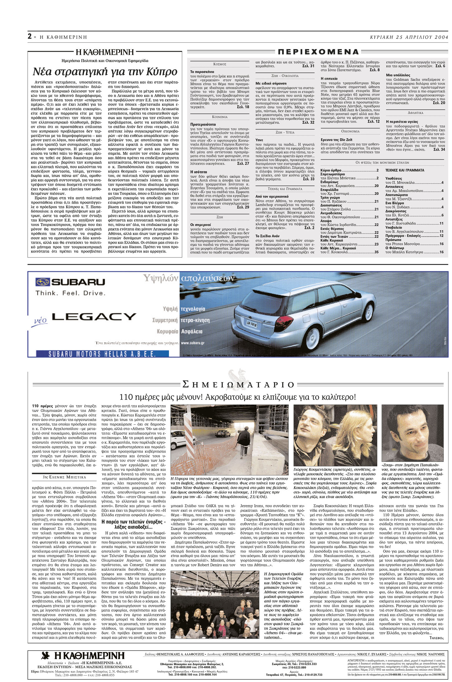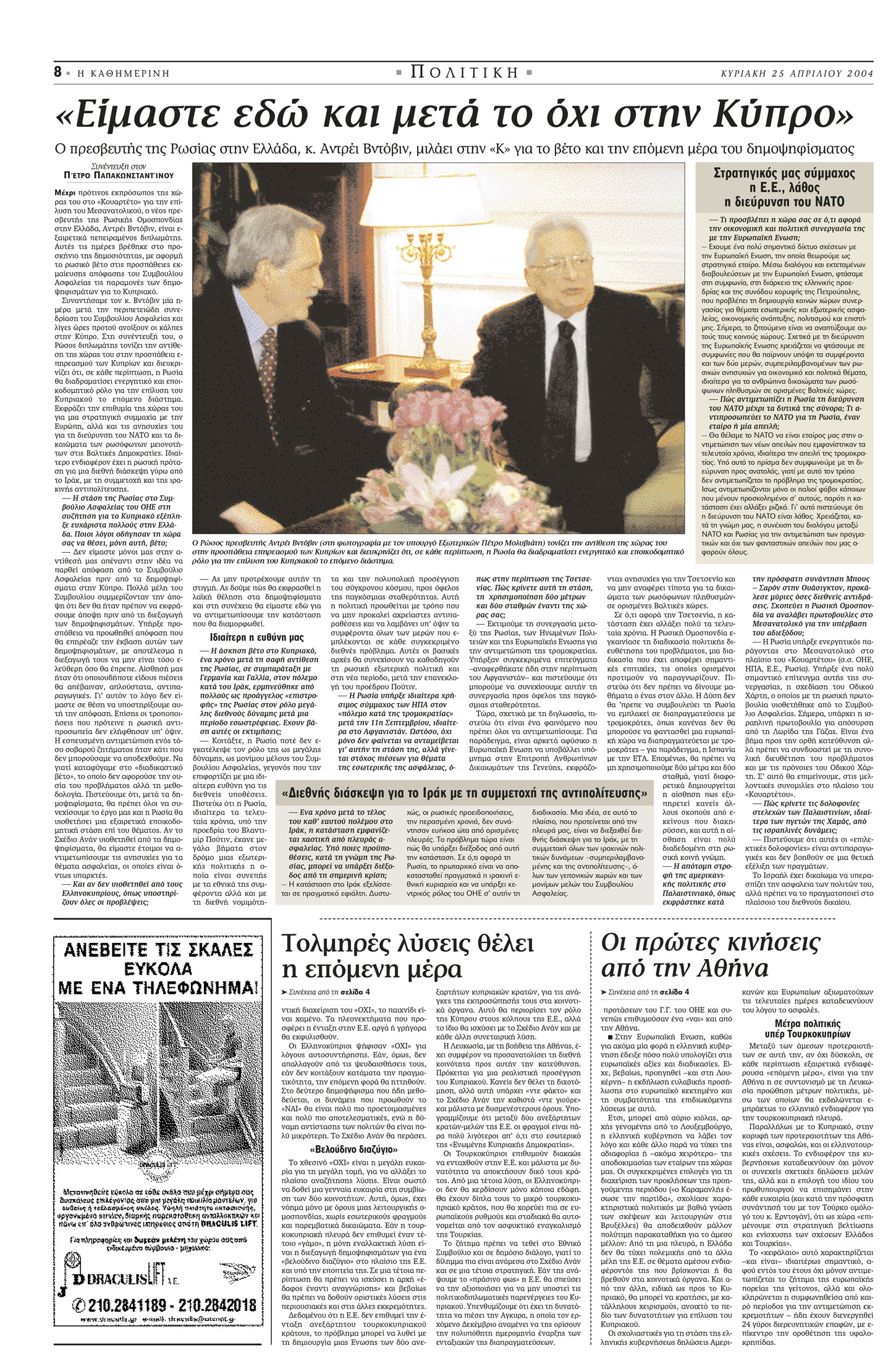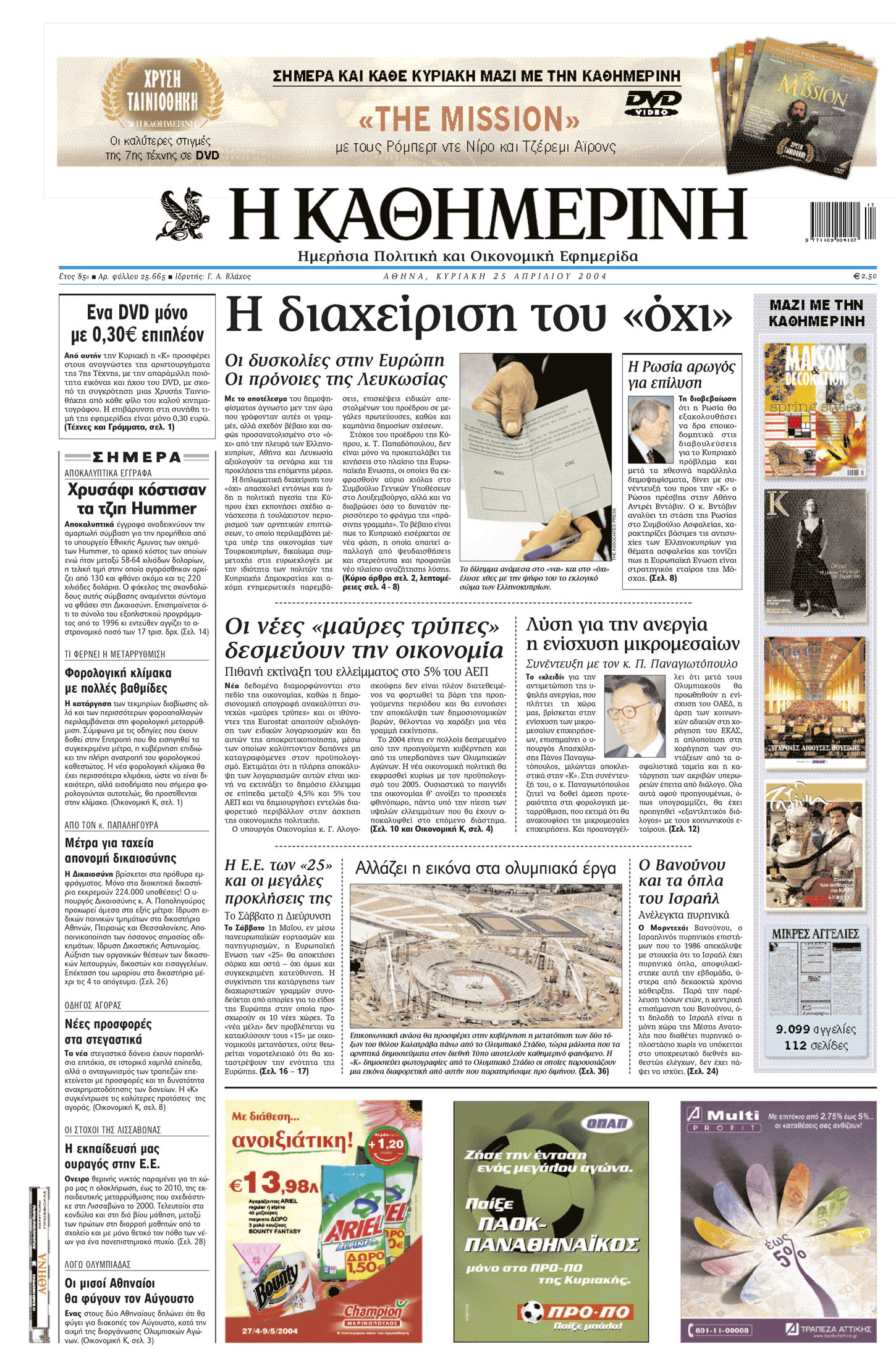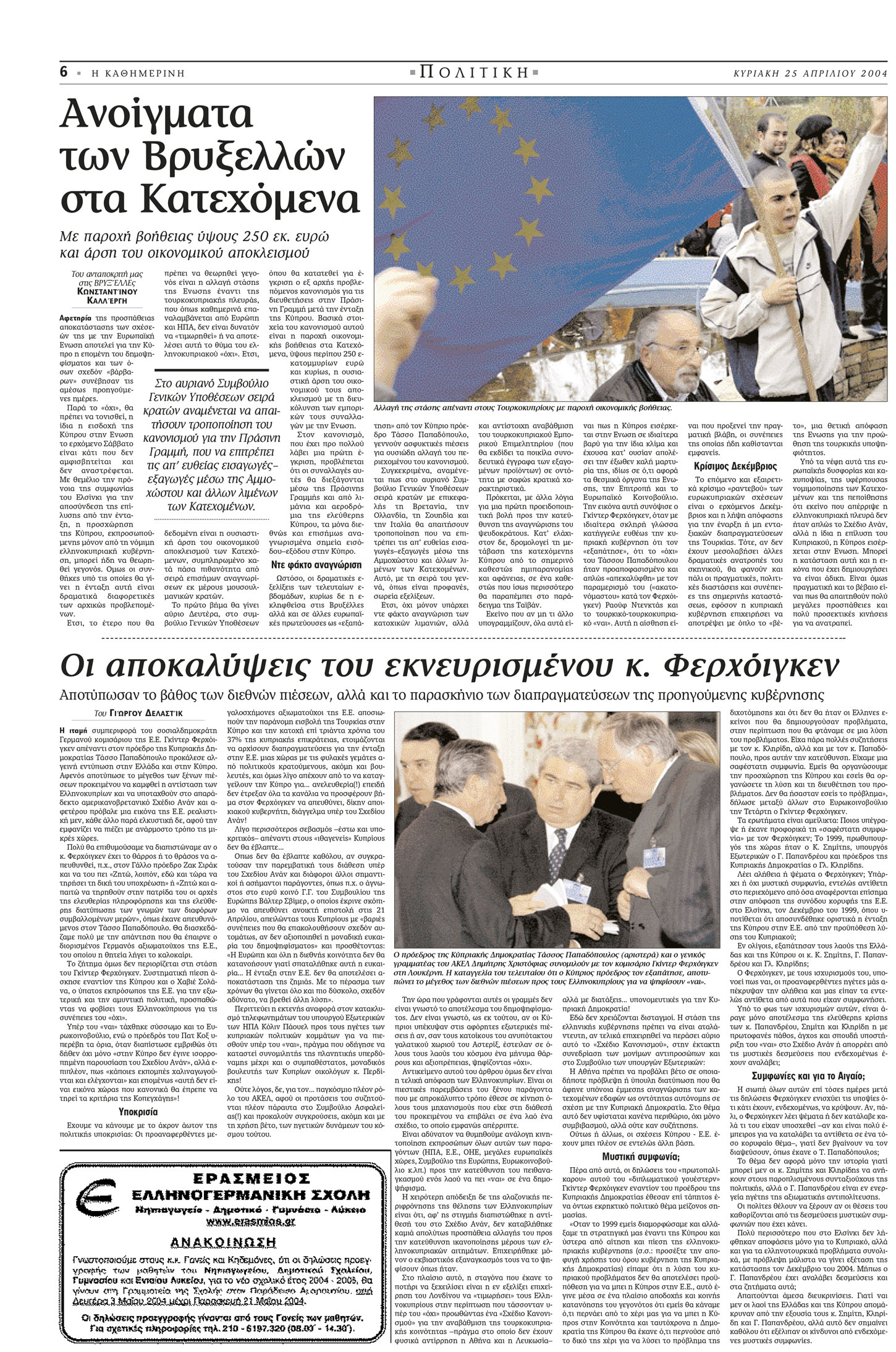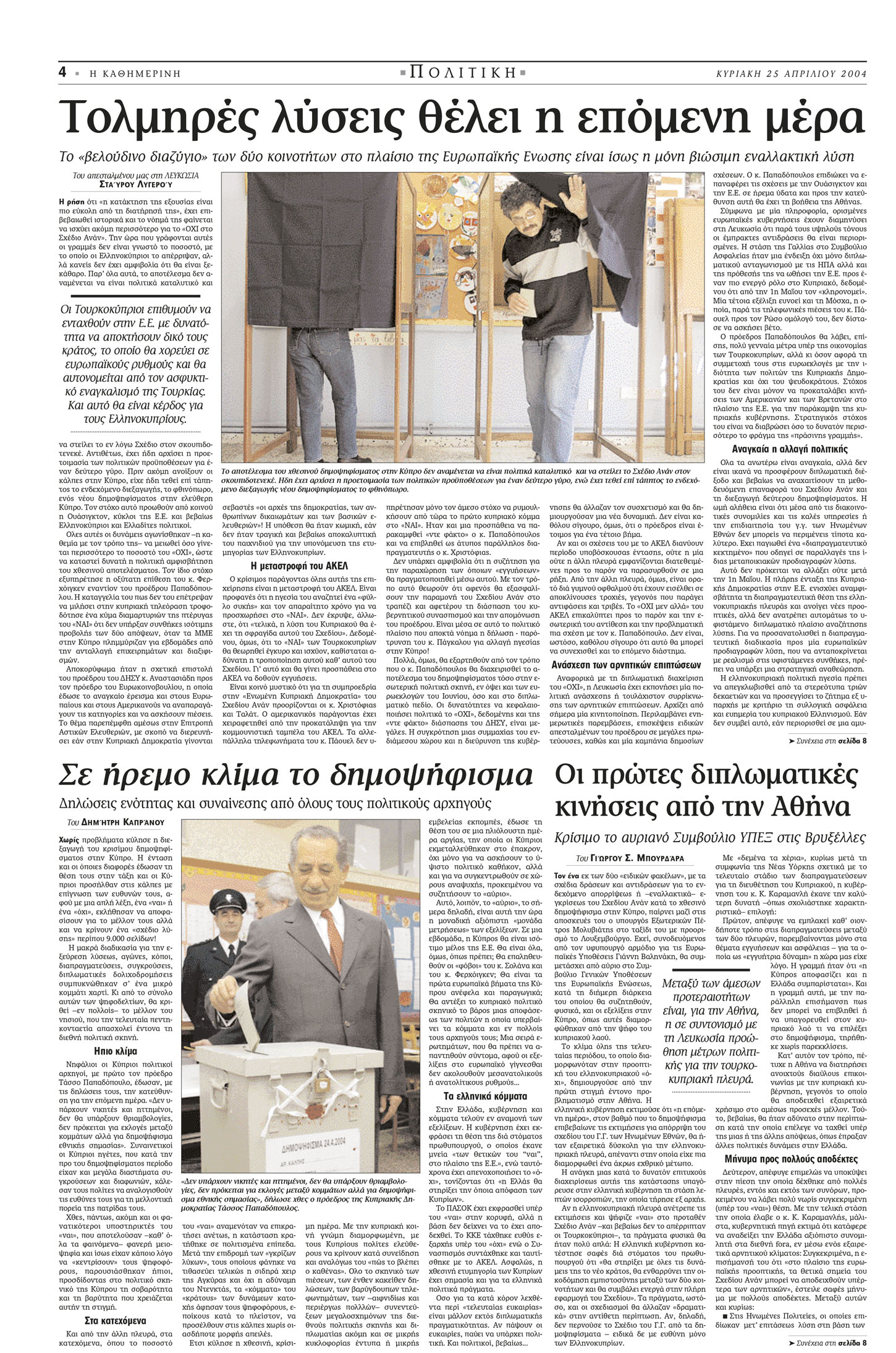 «Ό,τι και αν λεχθεί για Σχέδιο Ανάν ως “τελευταία ευκαιρία”, είτε ελέχθη με παρρησία είτε με την πρόθεση να εντείνει την πίεση προς τον ελληνοκυπριακό πληθυσμό, βέβαιον είναι ότι οι προσπάθειες επίλυσης του κυπριακού προβλήματος δεν τερματίζονται με τα δημοψηφίσματα – και μόνον γιατί οι λόγοι, που ώθησαν τα μέρη στο τραπέζι των συνομιλιών, εξακολουθούν υφιστάμενοι. Η μεγάλη πρόκληση να τεθεί πάλι το θέμα –και μάλιστα να τεθεί σε βάση δικαιότερη όσο και ρεαλιστική– βαρύνει την κυπριακή και ελληνική πλευρά, που καλούνται να επιδείξουν φαντασία, τόλμη, γενναιοδωρία και, ίσως πάνω απ’ όλα, ομοθυμία και αρραγή συντονισμό, για να ανατρέψουν την όποια δυσμενή εντύπωση έχει προκληθεί – και εξαιτίας των μεθοδευμένων πιέσεων.»