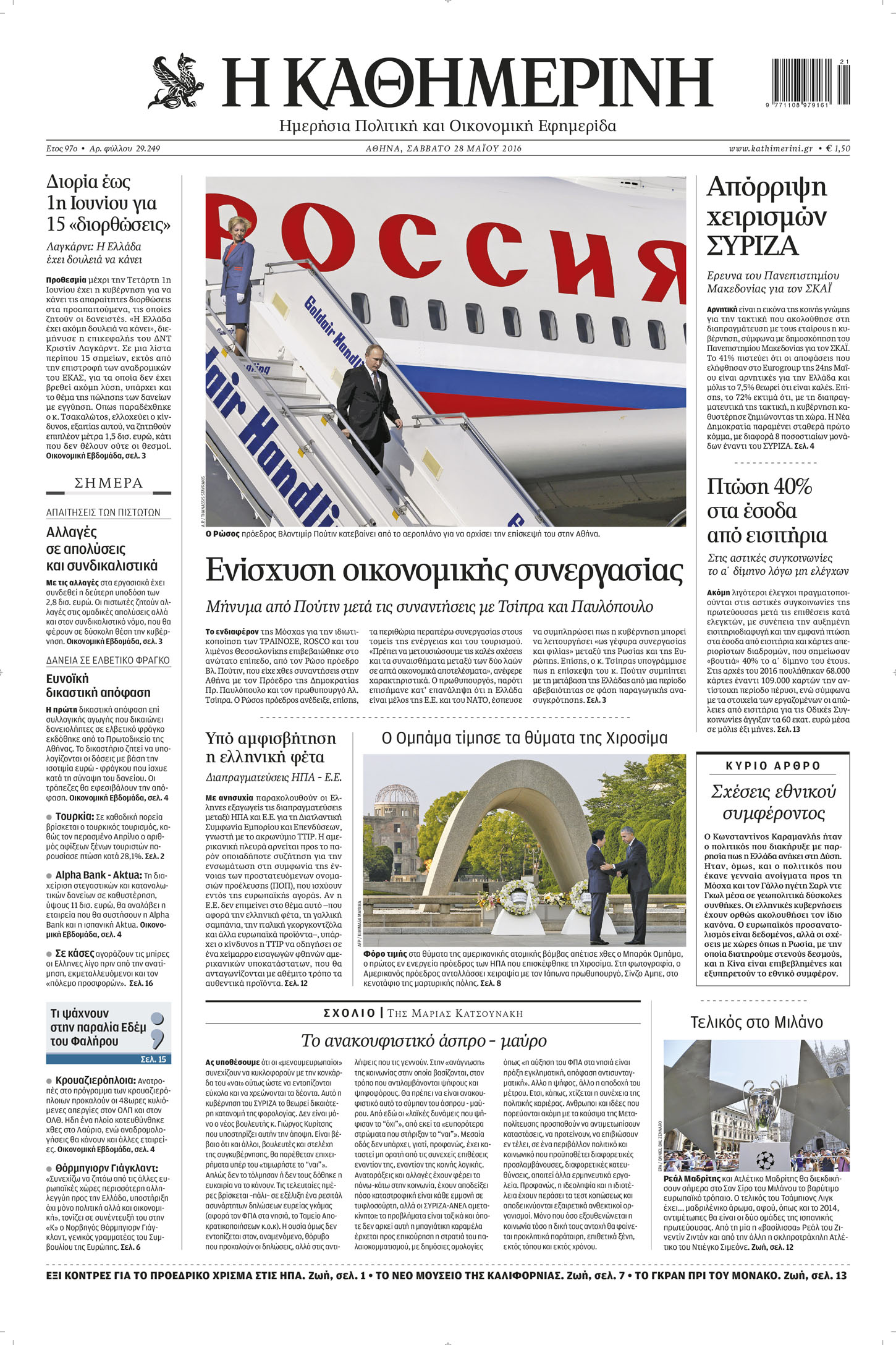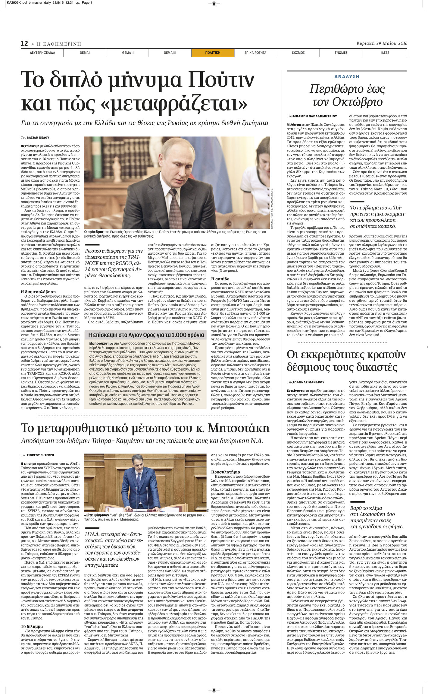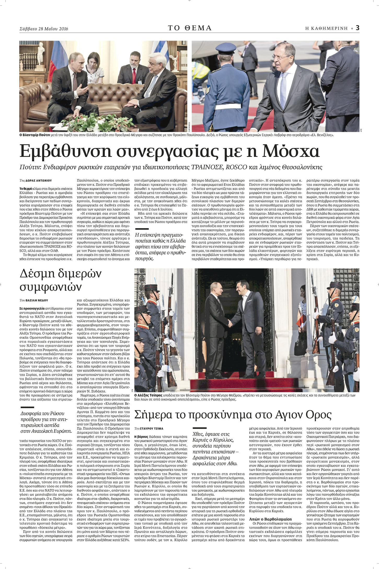 «Ως επίσκεψη με διπλό ενδιαφέρον τόσο στο εσωτερικό όσο και στο εξωτερικό γίνεται αντιληπτή η προχθεσινή επίσκεψη του κ. Βλαντιμίρ Πούτιν στην Αθήνα. Ο πρόεδρος της Ρωσικής Ομοσπονδίας εμφανίστηκε με μια διπλή ιδιότητα, αυτή του ενδιαφερόμενου για οικονομική και πολιτική συνεργασία με μια χώρα η οποία έχει για τη Μόσχα κάποια σημασία και εκείνη του ηγέτη διεθνούς βεληνεκούς, ο οποίος χρησιμοποίησε το βήμα των Αθηνών προκειμένου να στείλει μηνύματα για τις απόψεις της Ρωσίας σε σημαντικά ζητήματα προς όλες τις κατευθύνσεις.[…]