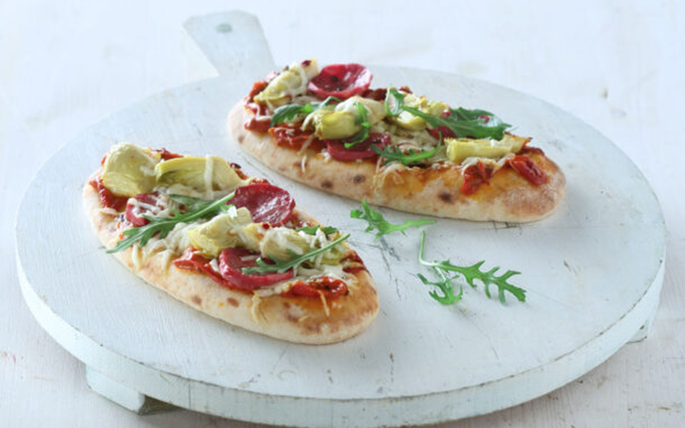 Για την πίτσα με σαλάμι Λευκάδας, αγκιναράκια από βάζο και ρόκα, προθερμαίνουμε το φούρνο στους 200° C.