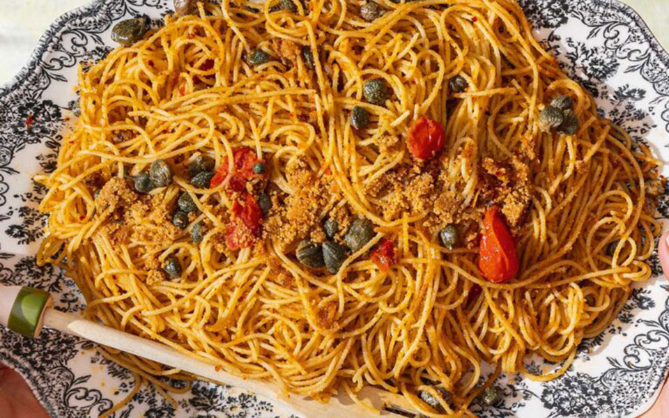 Για να φτιάξουμε σπαγκετίνιμε αντσούγιες και κάππαρη – spaghettini alle acciughe ecapperi, ξεκινάμε ζεσταίνοντας σε μια μέτρια κατσαρόλα 4 κουτ. σούπας από το ελαιόλαδο σε χαμηλή φωτιά και ρίχνουμε την πιπερίτσα, τα ντοματίνια, το σκόρδο και τις αντσούγιες.