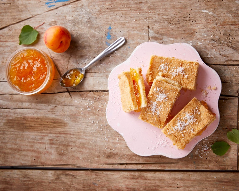 Δύο συνταγές σε μία. Απίθανες μπάρες καρύδας, όλο ενέργεια και γεύση, και μια αρωματική μαρμελάδα βερίκοκο. Ετοιμάστε μεγάλη ποσότητα από τη μαρμελάδα για να σας κρατήσει για πολύ πολύ καιρό.