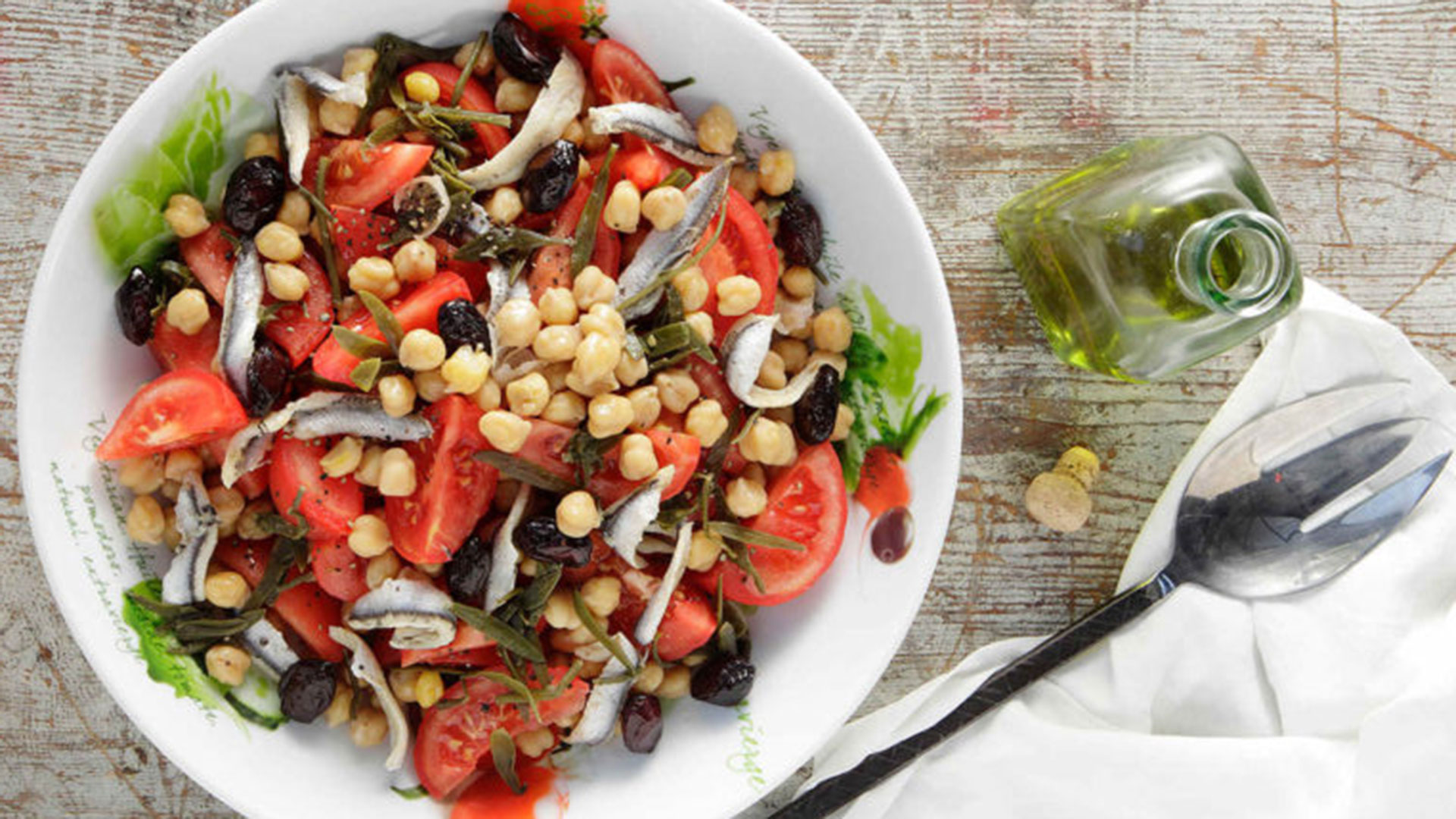 Αυτή η χορταστική οσπριοσαλάτα με ζουμερές ντομάτες, μαρινάτο γαύρο, ελιές και κρίταμο είναι ό,τι πρέπει για τα μεσημέρια του καλοκαιριού.