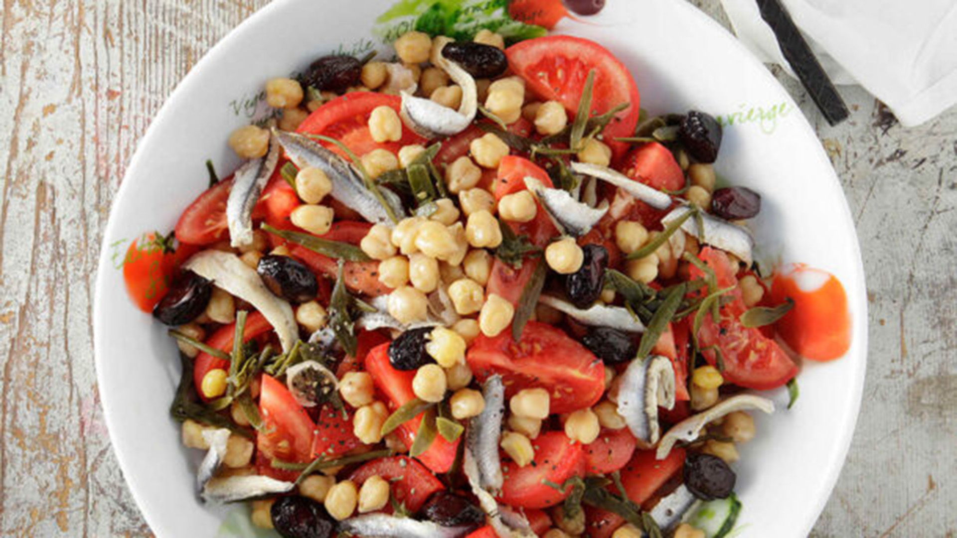Αυτή η χορταστική οσπριοσαλάτα με ζουμερές ντομάτες, μαρινάτο γαύρο, ελιές και κρίταμο είναι ό,τι πρέπει για τα μεσημέρια του καλοκαιριού.