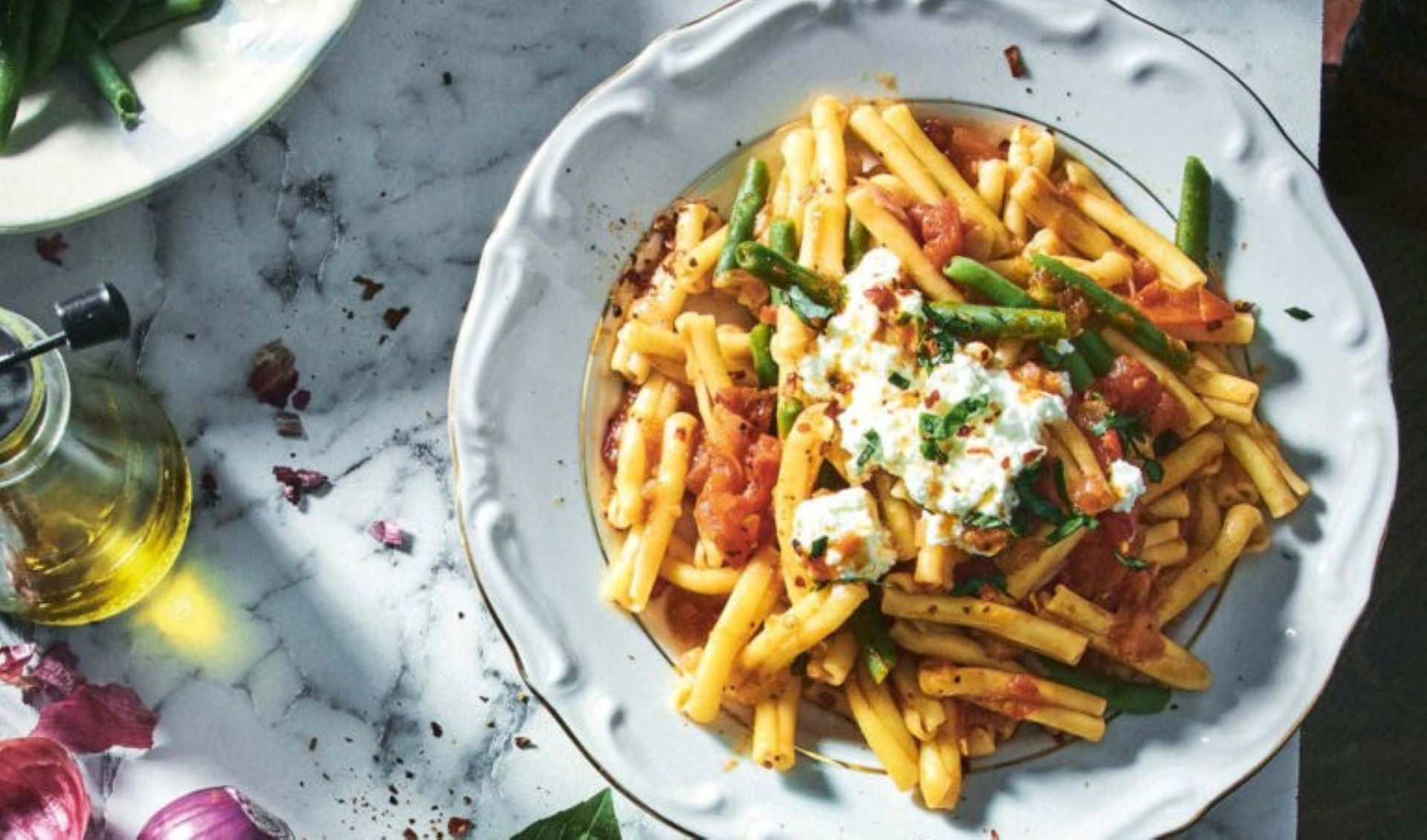 Στην Μπαζιλικάτα, επαρχία της νοτιοανατολικής Ιταλίας, τα φασολάκια είναι αγαπητό υλικό. Η συνταγή, caputi con i fagiolini occhipinti e i pomodorini freschi, φτιάχνεται με φρέσκα τρυφερά φασολάκια μιας ντόπιας ποικιλίας μαυρομάτικου («occhipinti» σημαίνει «βαμμένα μάτια»). Εμείς μπορούμε να το φτιάξουμε με οποιαδήποτε φρέσκα φασολάκια και ιδανικά με αμπελοφάσουλα.