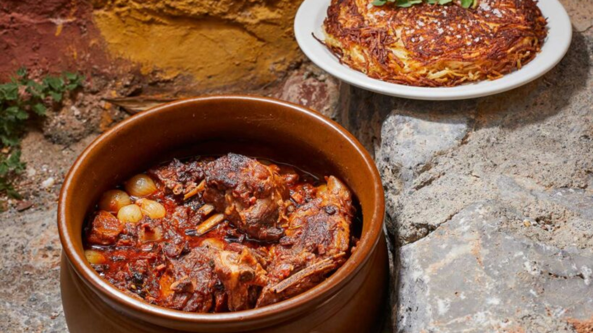 Αρνάκι καπαμά με τηγανίτες από στικ πατάτας, η συνταγή του σεφ είναι για γάστρα και εμπλουτίζεται με κρεμμυδάκια του στιφάδου και παστό χοιρινό.