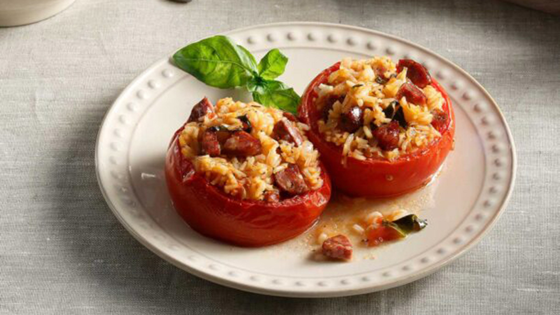 Για τις ντομάτεs γεμιστέs με ρύζι, χωριάτικο λουκάνικο και βασιλικό ξεκινάμε και προθερμαίνουμε το φούρνο στους 180° C και λαδώνουμε ένα ταψί που ιδανικά να χωράει τις ντομάτες ακριβώς.