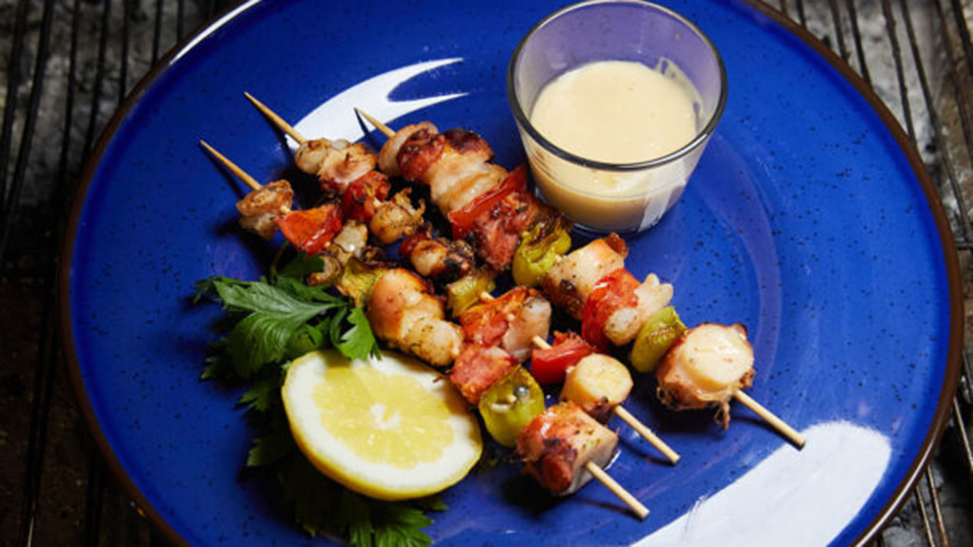 Για να φτιάξουμε σουβλάκια θαλασσινών πρώτα κόβουμε τα πλοκάμια του χταποδιού σε κομμάτια 2½-3 εκ. Το χταπόδι (εξ ου και το όνομα) έχει οκτώ πλοκάμια. Υπολογίζουμε λοιπόν από ένα πλοκάμι για το κάθε σουβλάκι μας.